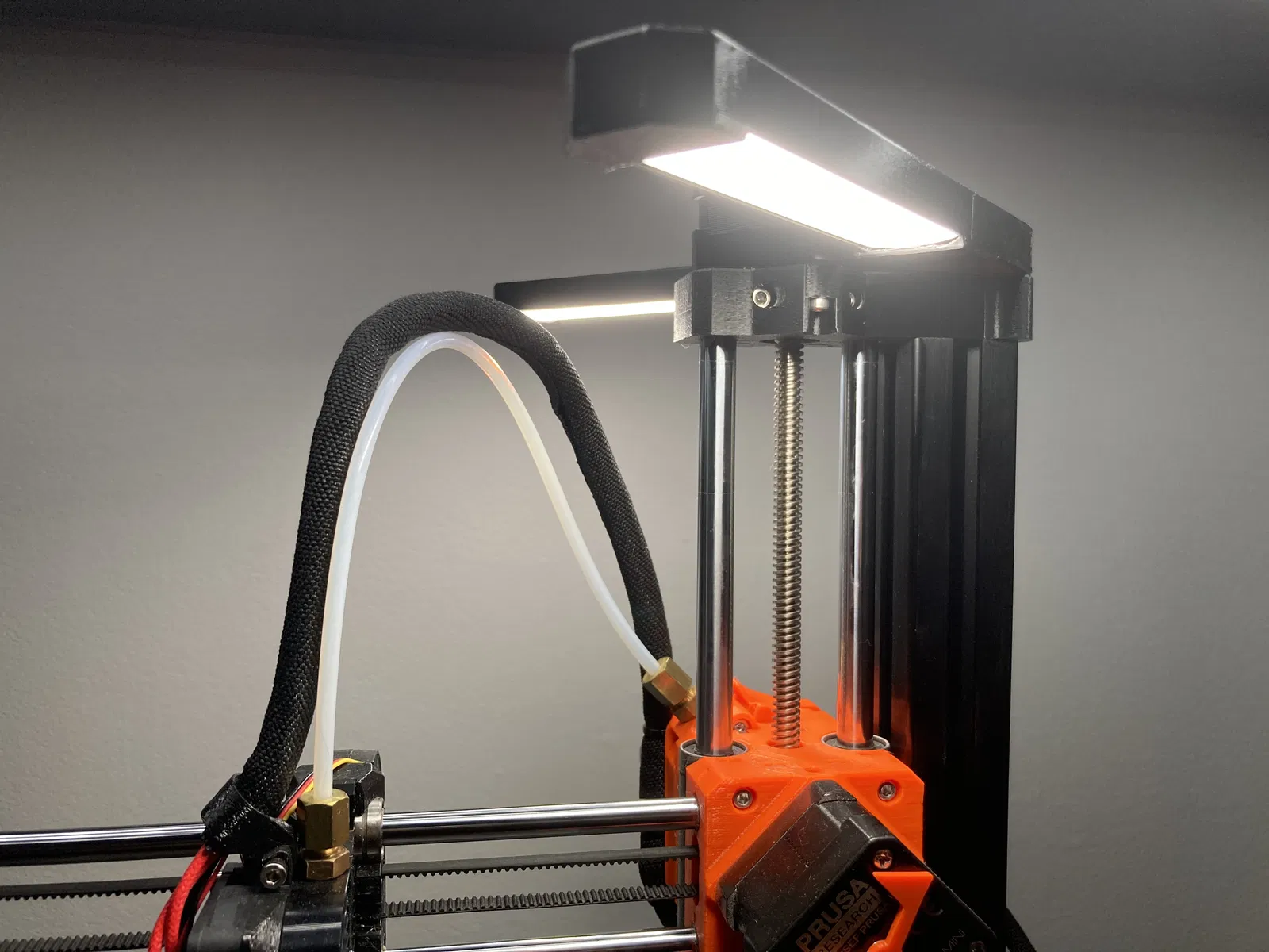 Thanh đèn LED cho Prusa MINI. Giá đỡ được thiết kế để vừa với thanh nhôm hình chữ U kích thước 11x24mm và có khoang rỗng bên trong để luồn dây xuống mặt sau khung máy in cho gọn gàng. Giá đỡ cũng có một lỗ để gắn công tắc nguồn. Dải đèn LED có thể được cấp nguồn bằng bộ nguồn của máy in bằng cách sử dụng dải đèn LED 24V.