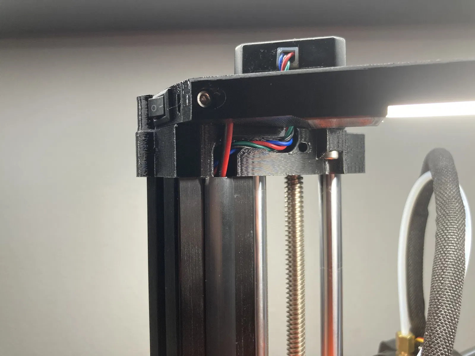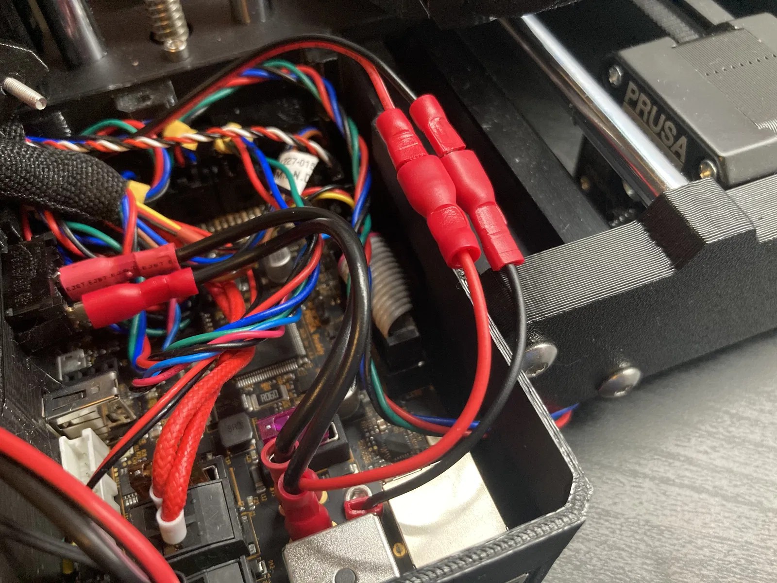 Để kết nối với +24V, chúng ta sẽ thêm một dây nối (pigtail) vào một trong các dây đi đến công tắc nguồn của MINI. Các dây này có thể được tháo ra và thay thế bằng một dây có dây nối được lắp sẵn. Bạn có thể thay thế bất kỳ dây nào, dây gần phía sau máy in hơn sẽ cung cấp 24V ngay cả khi máy in đã tắt, dây gần phía trước máy in hơn sẽ chỉ cung cấp 24V khi máy in được bật. Tôi thích thay thế dây gần phía sau hơn.