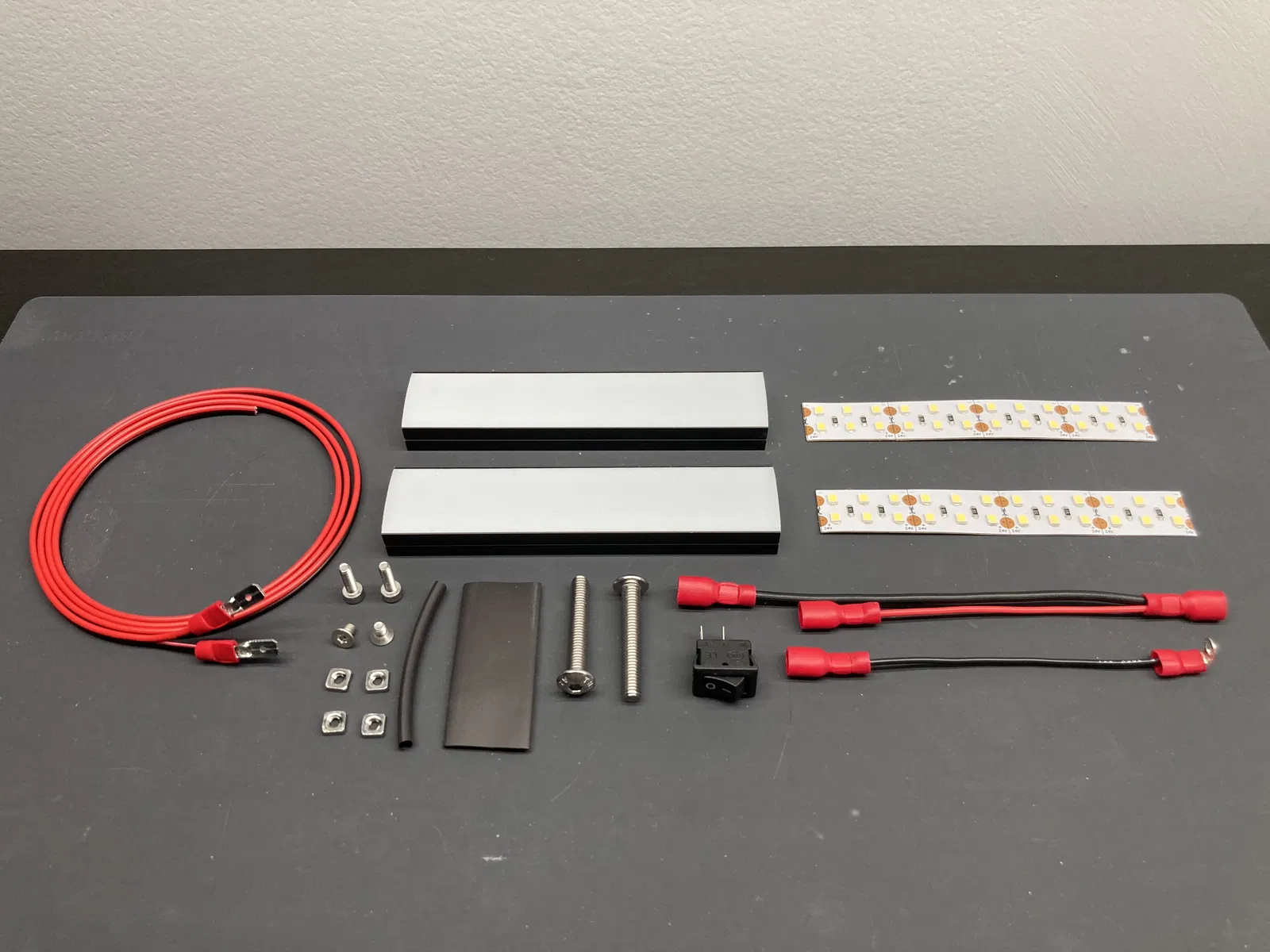 Phần cứng yêu cầu (v2): Thanh nhôm chữ U Dải đèn LED hai hàng 24V Dây AWG 22 Công tắc nguồn (KCD11 10x15mm) Số lượng: 4 - Đai ốc vuông M3 mỏng (dày 1.8mm) Ốc vít: Số lượng: 2 - Ốc M5 x 30mm đầu tròn Số lượng: 2 - Ốc đầu mũ M3 x 10mm Số lượng: 2 - Ốc đầu chìm M3 x 5mm (Bộ phận được thiết kế cho ốc đầu chìm nhưng cũng có thể thay thế bằng ốc đầu mũ M3x10)