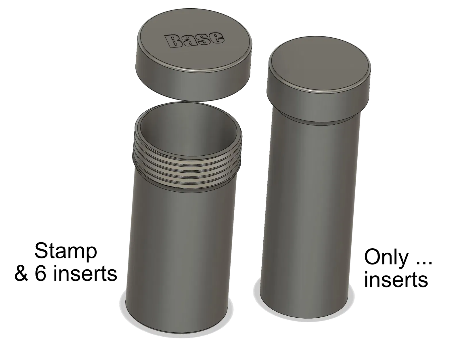 Bộ ống lưu trữ cho swappable stamp và các insert, giúp tách riêng từng bộ sưu tập insert. Có ống lớn cho base kit và các ống khác cho bộ chỉ insert. File Fusion360 cho phép chỉnh kích thước theo số lượng insert.