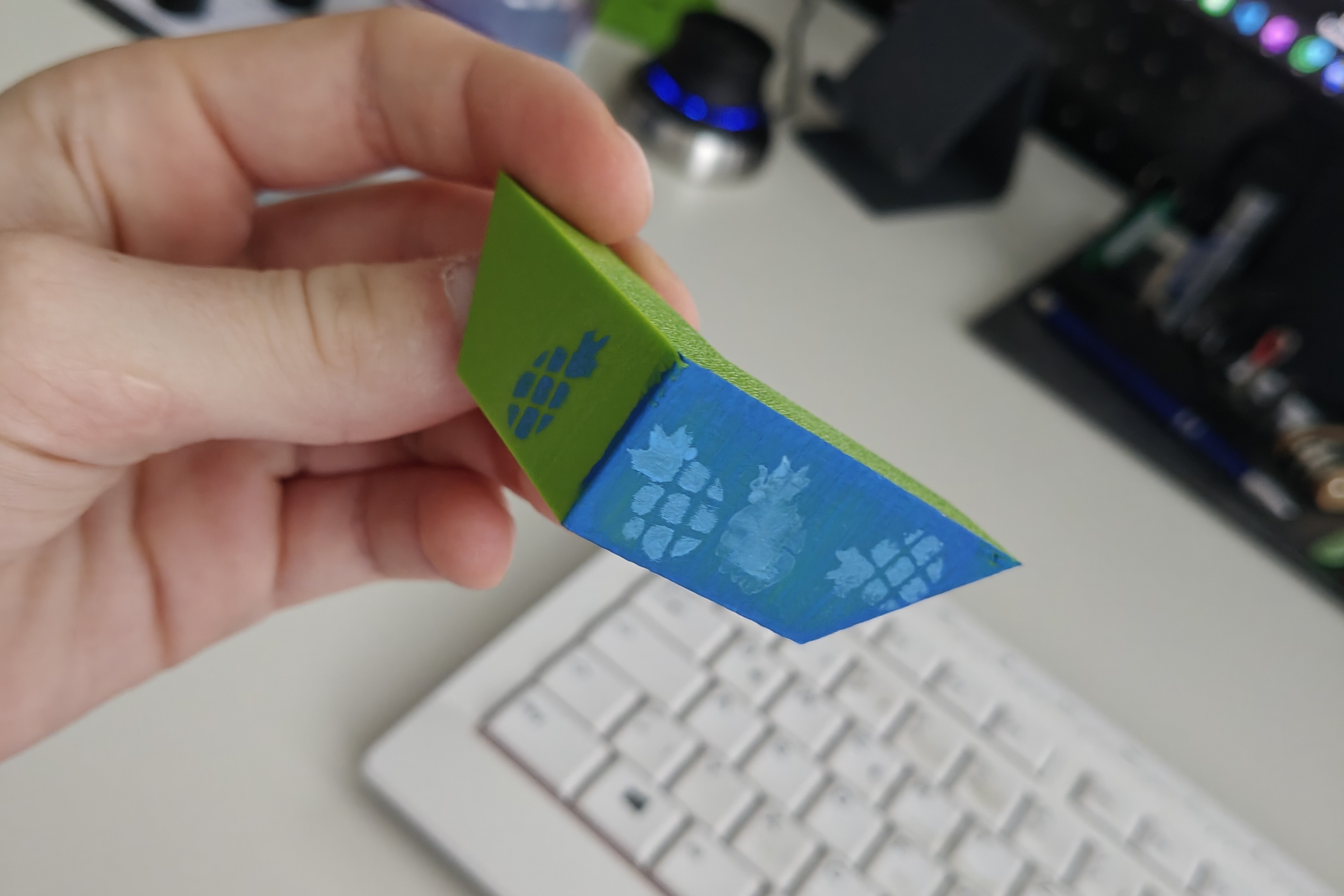 Với các chi tiết nhỏ của trái thơm (pineapple), mình in 3D một cái template và thử trước trên một model khác. Sau vài lần thử thì mình có được quy trình ổn. Nên bạn cứ luyện chút xíu trước khi bắt đầu cho đỡ hư.