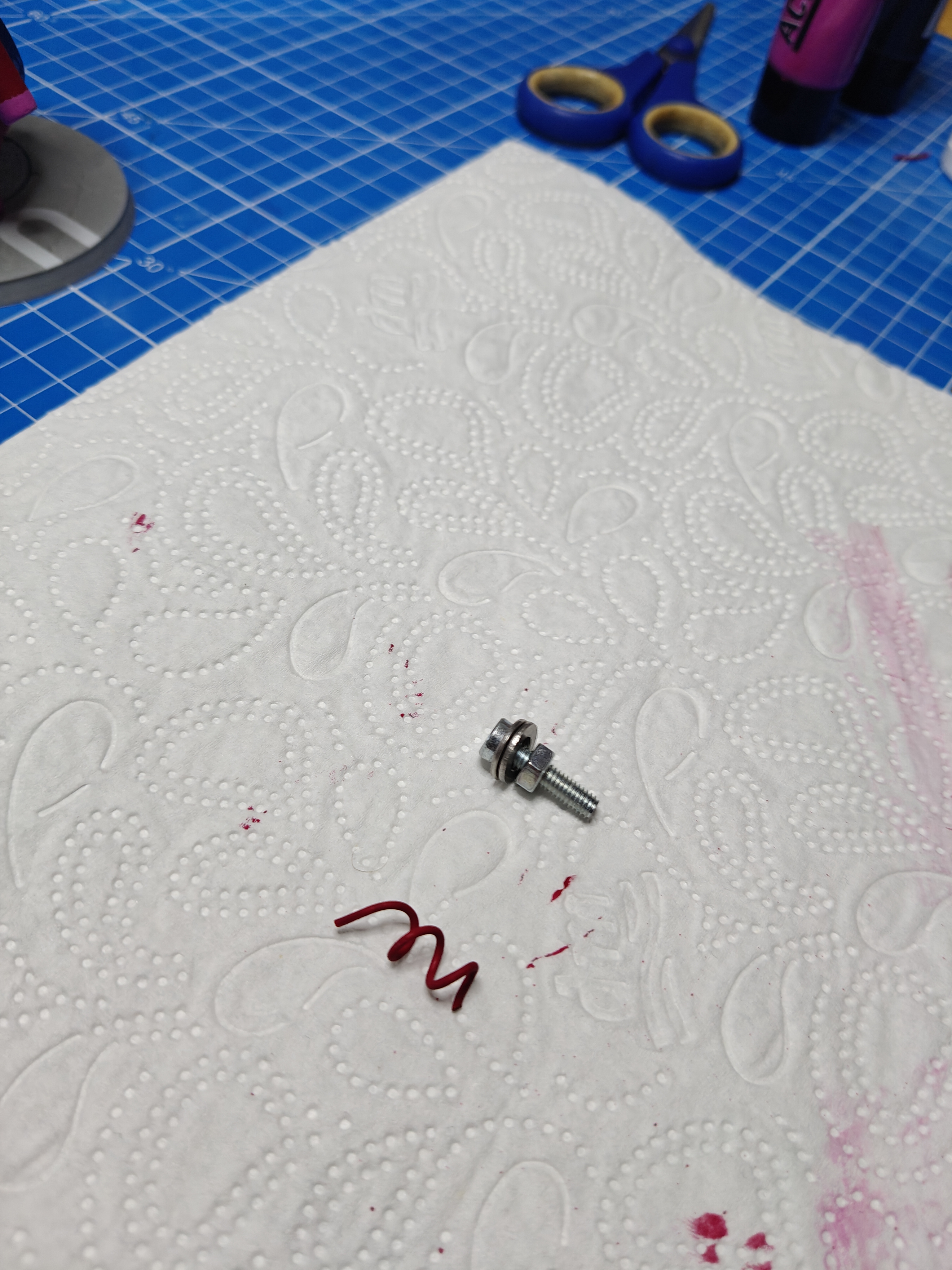 Phần đuôi mình dùng một sợi dây điện mỏng. Sợi dây này được quấn quanh một con ốc M3 và cố định trong 24 giờ. Mình sơn lót phần đuôi với chiều dài dư ra rồi cắt lại đúng kích thước.