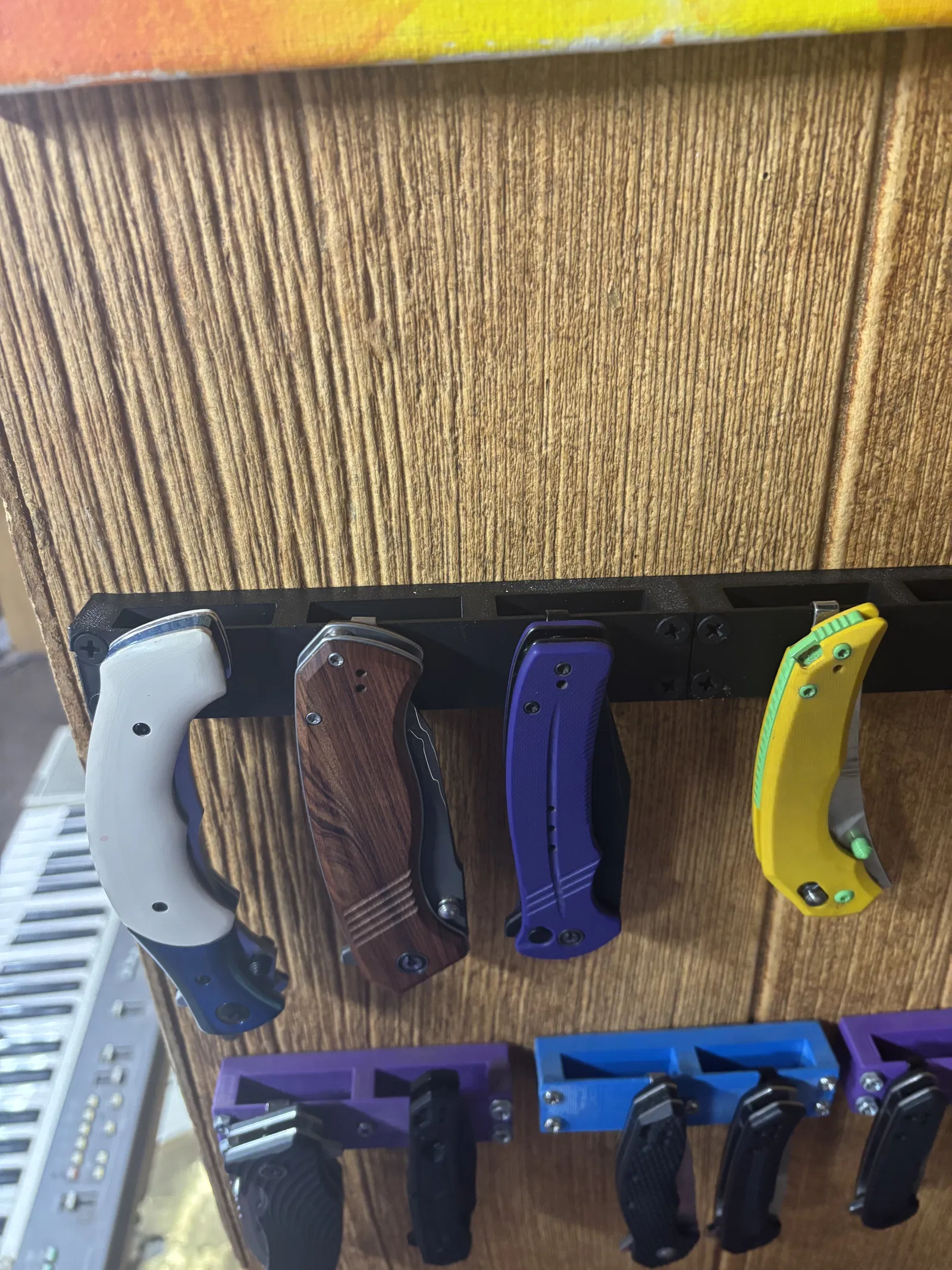 Giá treo tường dành cho các loại dao có kẹp túi (pocket clip). Lắp lên tường bằng vít gỗ #6 (Interior). Phù hợp để treo dao gọn gàng, dễ lấy và tiết kiệm không gian.