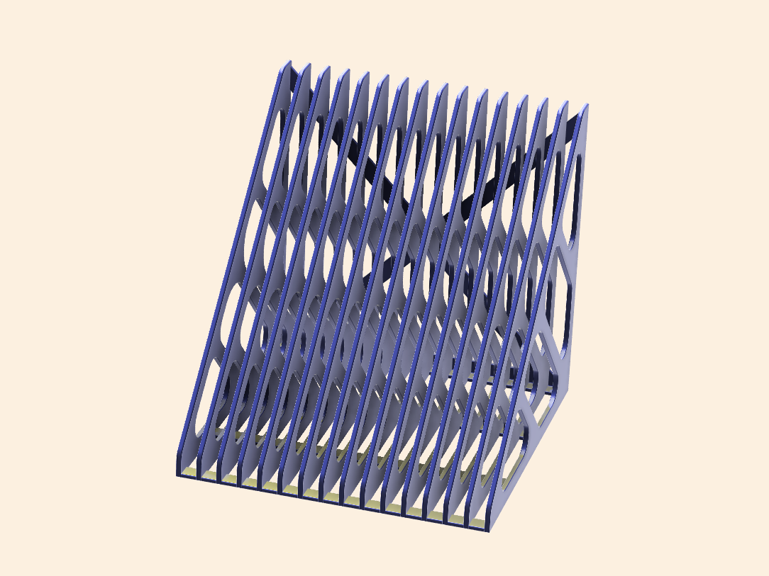 Kệ đựng đĩa vinyl với 15 khe. Mỗi khe rộng 9 mm nên phù hợp với đa số đĩa. Không cần supports. Thiết kế canh kích thước để vừa khít khay in của MK4S. In bằng PLA với nozzle 0.4 mm, infill 10% và layer height 0.2 mm.