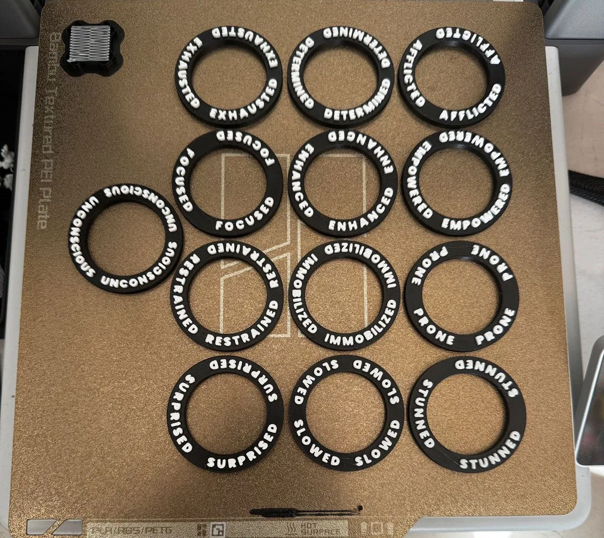 Bộ condition rings cho Cosmere RPG giúp theo dõi trạng thái mini dễ hơn. File đã scale 1.75x, có thể scale xuống để hợp mọi kích cỡ (muốn vòng 1” thì scale 67.73%). In 2 màu bằng Bambu Labs AMS hoặc sơn trắng cho chữ rõ.
