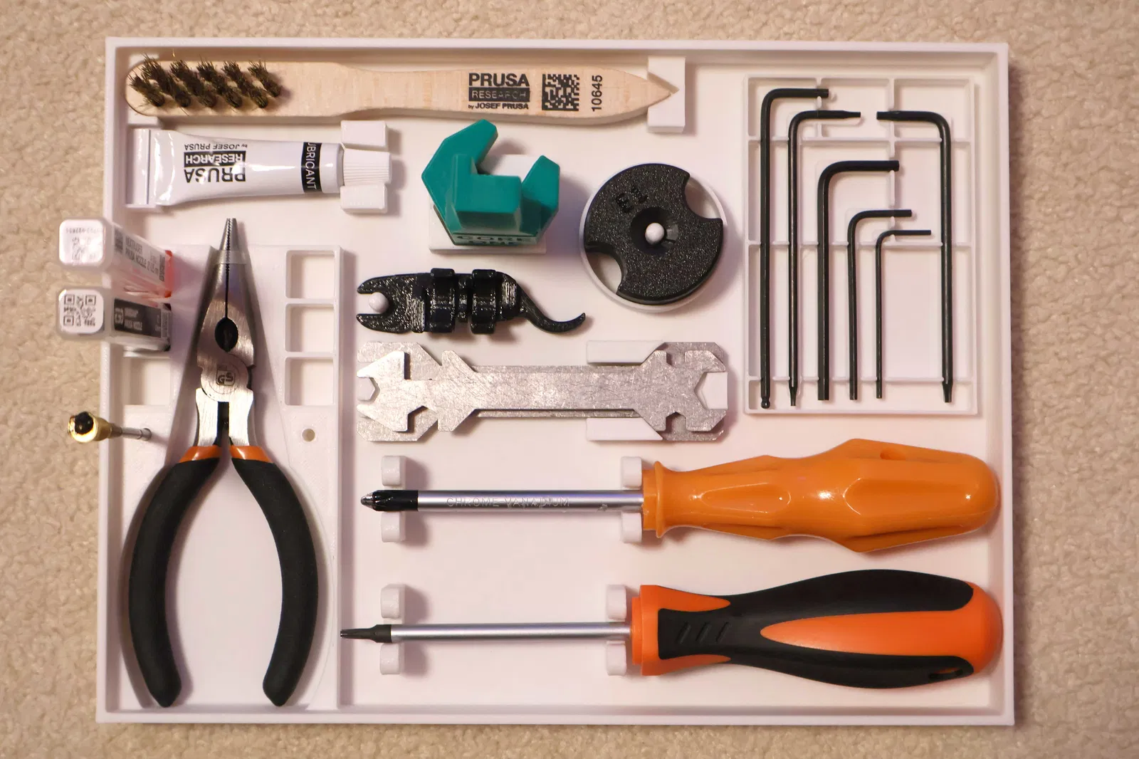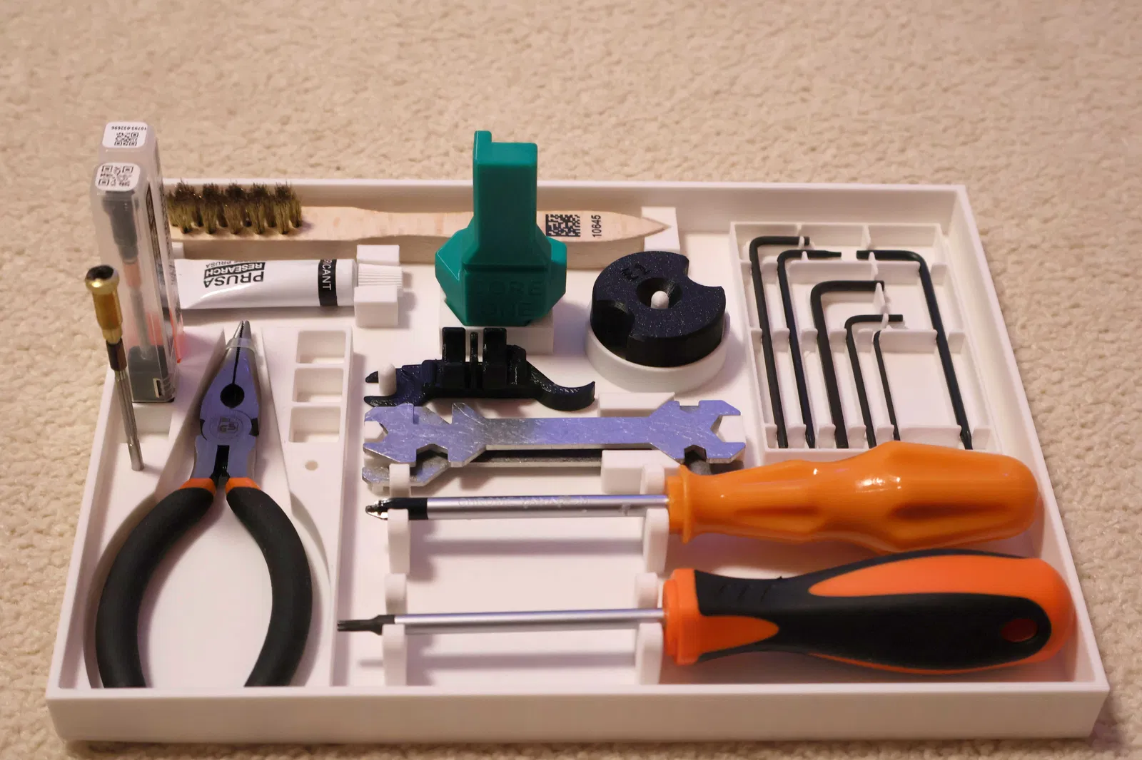 Mấy cái chỗ để cờ lê và lục giác với chỗ để kềm là mình chỉnh sửa lại từ mẫu của Drovious thôi, còn lại là thêm chỗ đựng bàn chải đồng, hộp đầu phun Nextruder, chỗ đựng tuýp dầu bôi trơn với tất cả dụng cụ in 3D của bộ CORE ONE. Mình cũng có thêm chỗ đựng dụng cụ thay đầu phun (phiên bản không dùng ống co silicone nha).