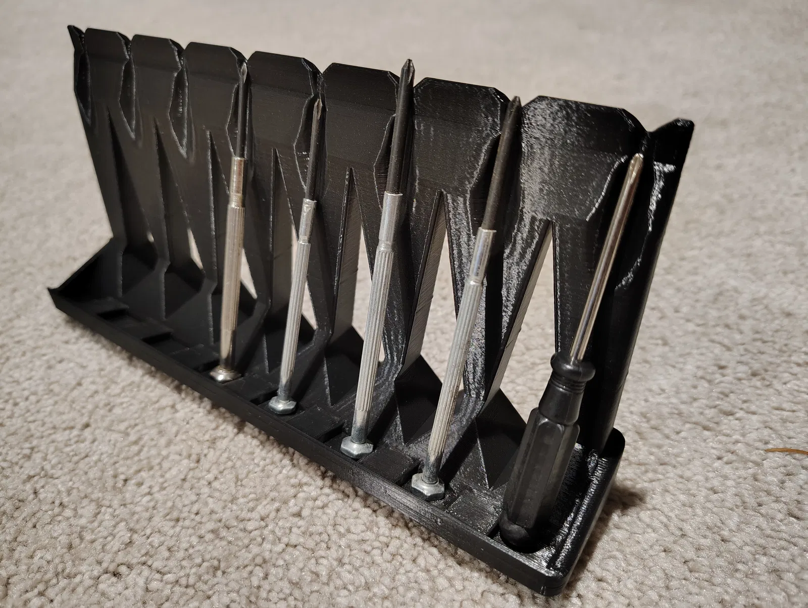 Mình làm cái này để giữ 8 cây tua vít mình mua kèm bộ dụng cụ sửa kính từ mấy năm trước: https://www.amazon.com/dp/B095SDNYNZ và từ đó tới giờ cứ để lăn lóc trong phòng máy tính mà không có chỗ “ở” đàng hoàng.