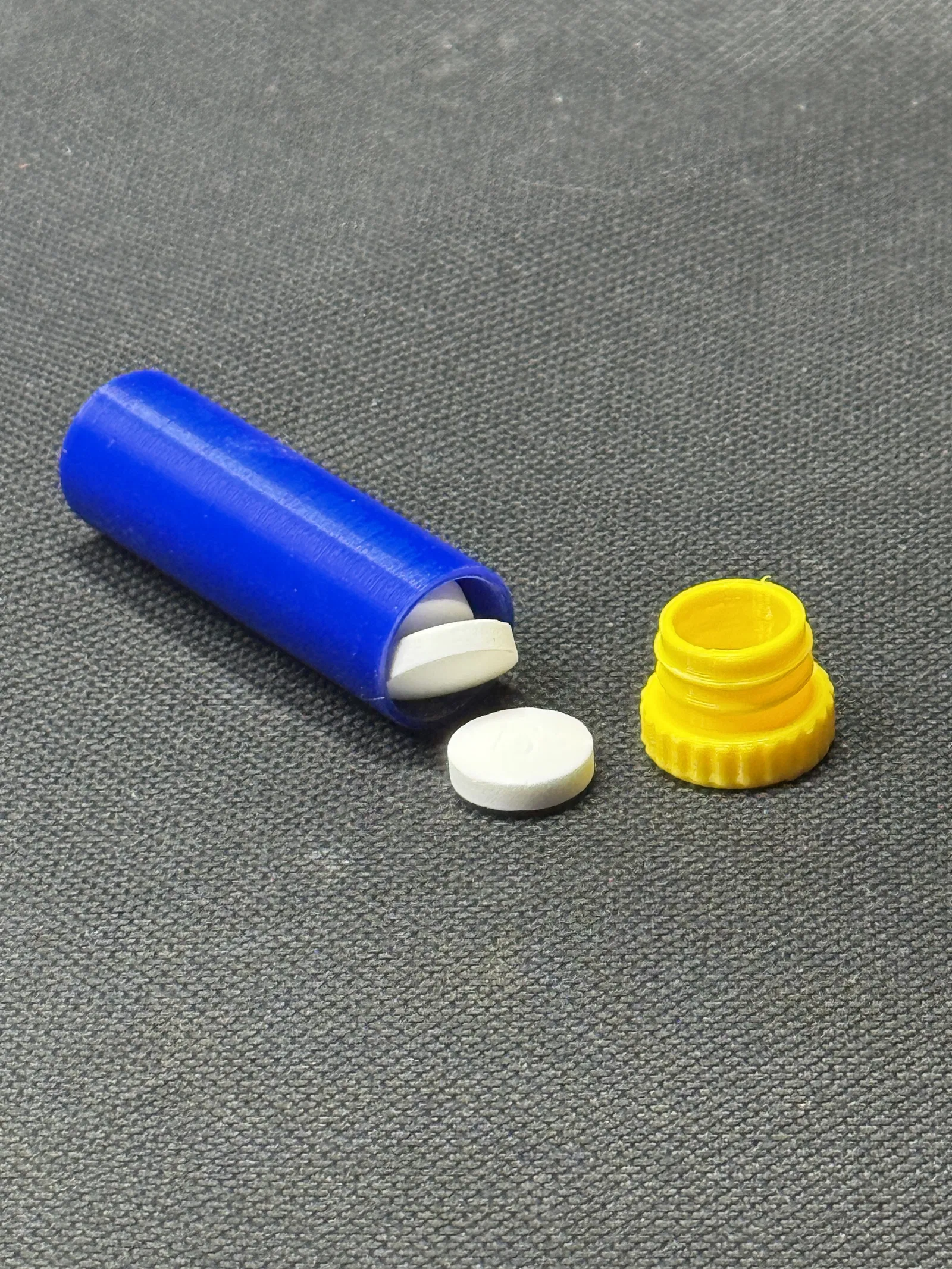 Đây là một hộp đựng thuốc rất đơn giản. Không cầu kỳ, không ren vặn, nhỏ gọn và ngăn nắp. Nắp được in bằng TPU, còn ống nhỏ có thể làm từ bất kỳ loại filament nào.