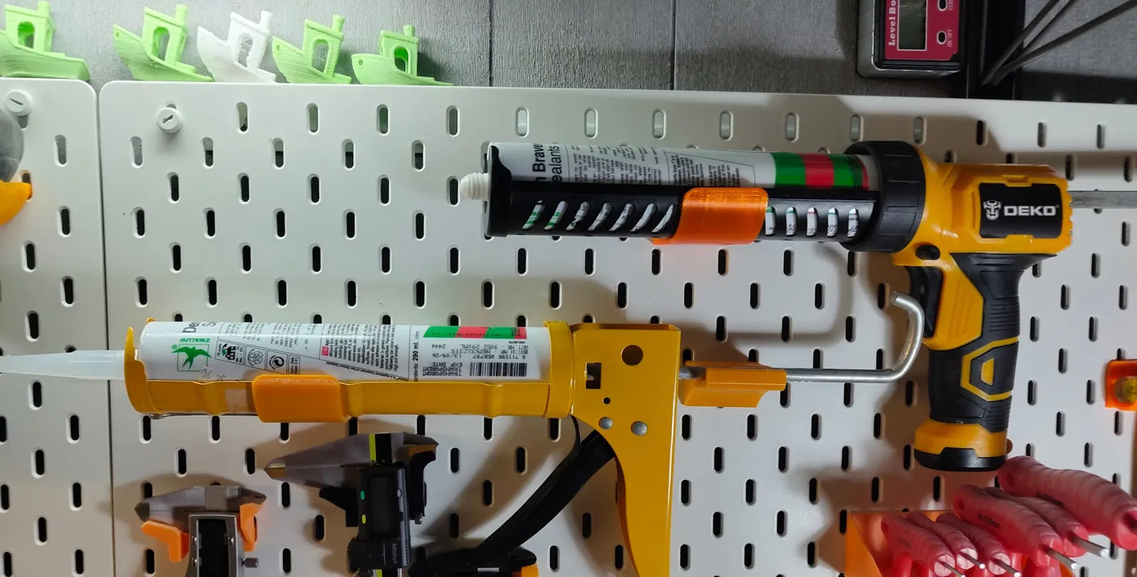 Mẫu Ikea Skadis Caulking Gun Holder: giá treo súng bắn keo gắn bảng Ikea Skadis. Không cần support, chỉ cần in úp mặt để ra bề mặt đẹp và chắc chắn. Có kèm link tham khảo súng bắn keo Deko.