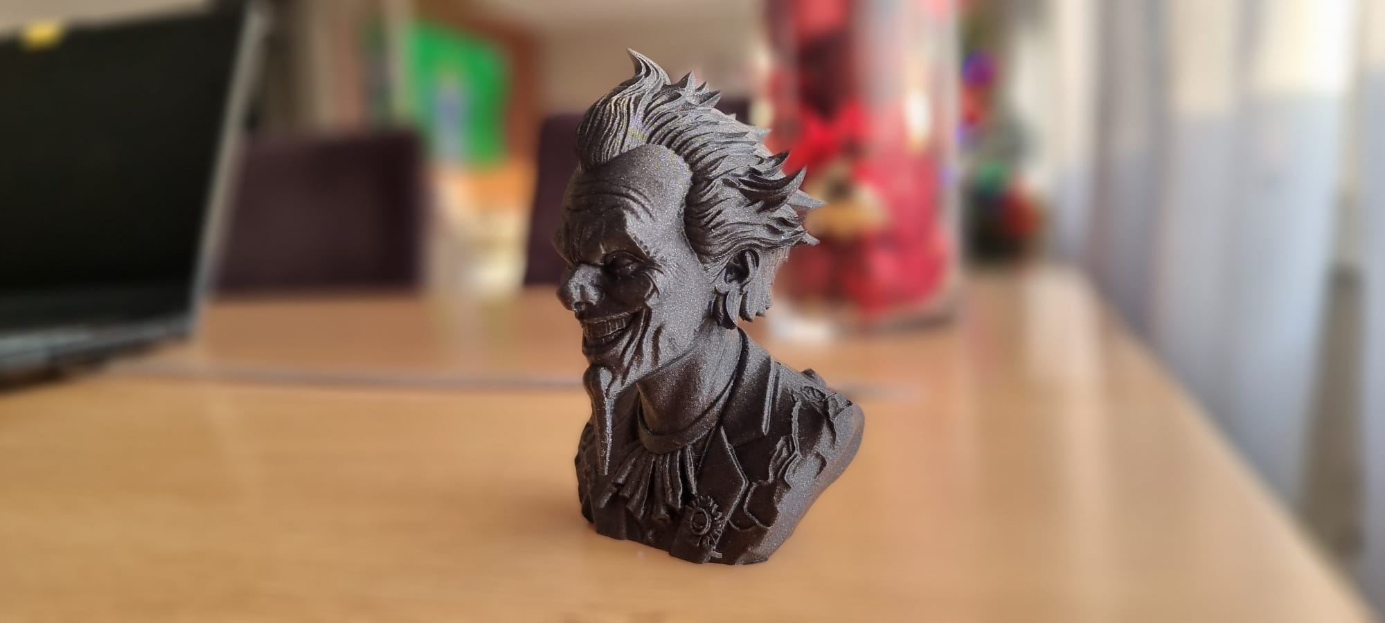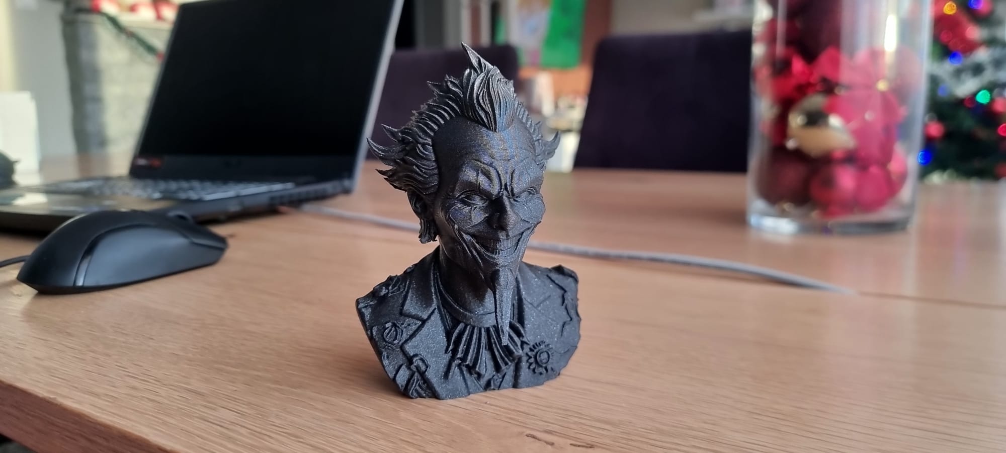 Mẫu bust The Joker với nụ cười rộng và ánh mắt trũng sâu, tạo cảm giác vừa đe doạ vừa điên loạn. Gợi ý in: supports cho 3 auto, outer brim only, brim width 10 mm, layer height 16 mm.