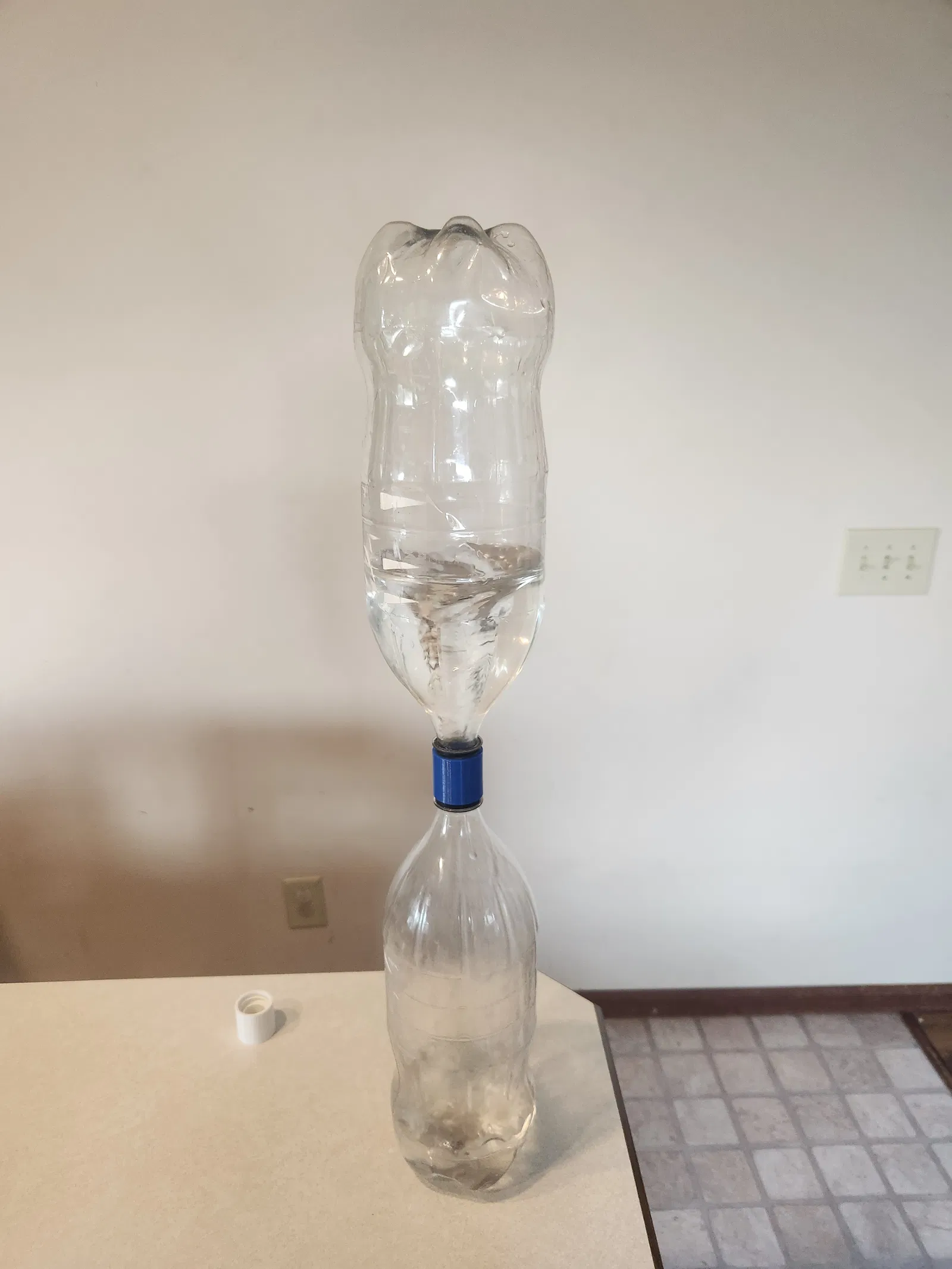 Đầu nối giúp ghép 2 chai 2 lít để tạo xoáy nước “tornado”. Ren chuẩn chai 2 lít US PCO28 1881, có thể hợp chai OD ~28mm, pitch 2.7mm. In cần supports; PLA dễ tháo support hơn PETG.