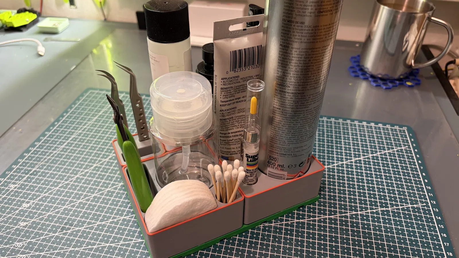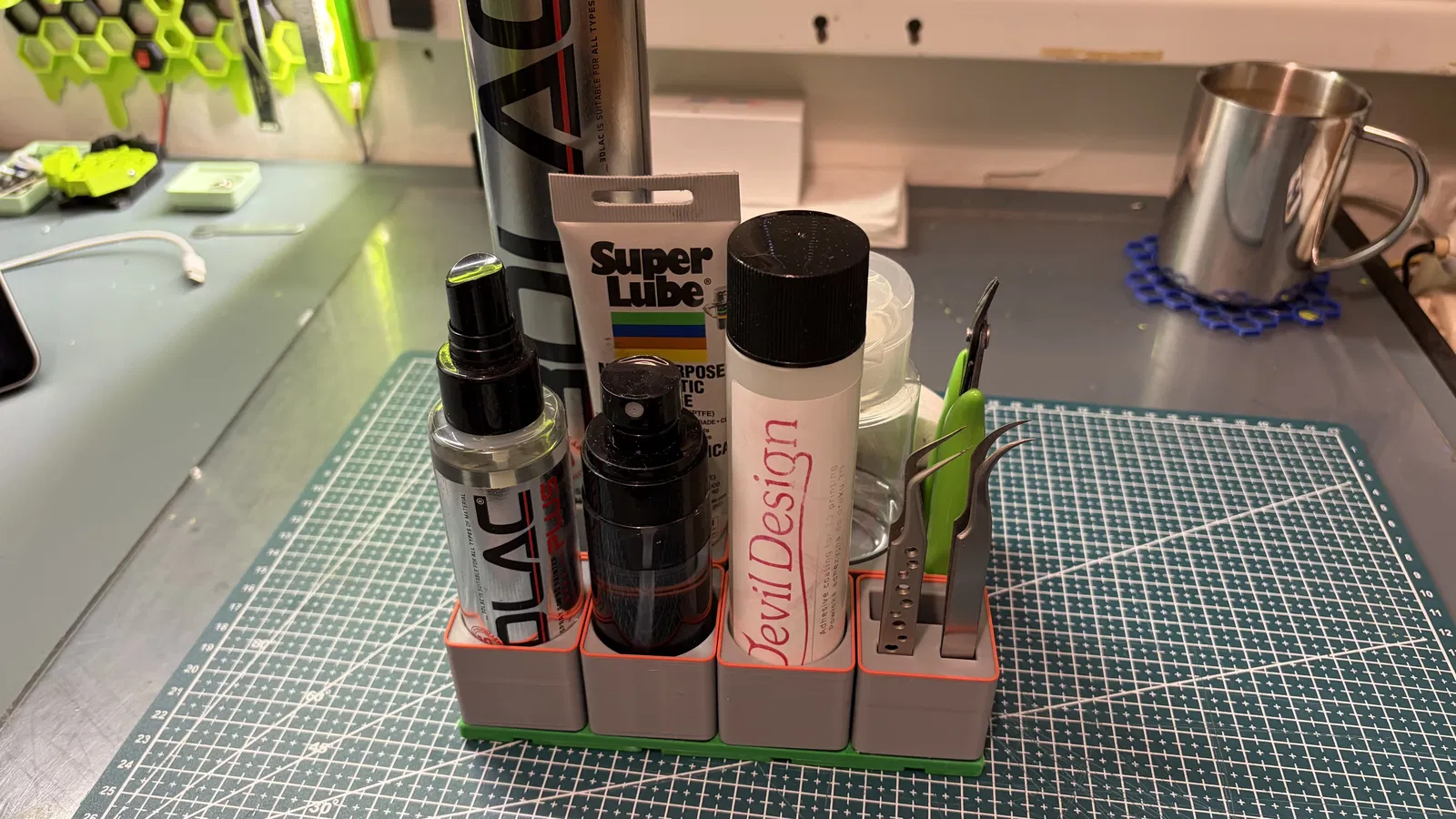 Bộ Gridfinity basic printer set giúp gom gọn keo, dụng cụ và vật tư cho máy in 3D: có đế gridfinity, các ngăn bắt bằng vít in, chỗ cho 3DLAC, IPA, SuperLube, kềm cắt, nhíp và khay nhỏ cho nozzle/ốc vít.