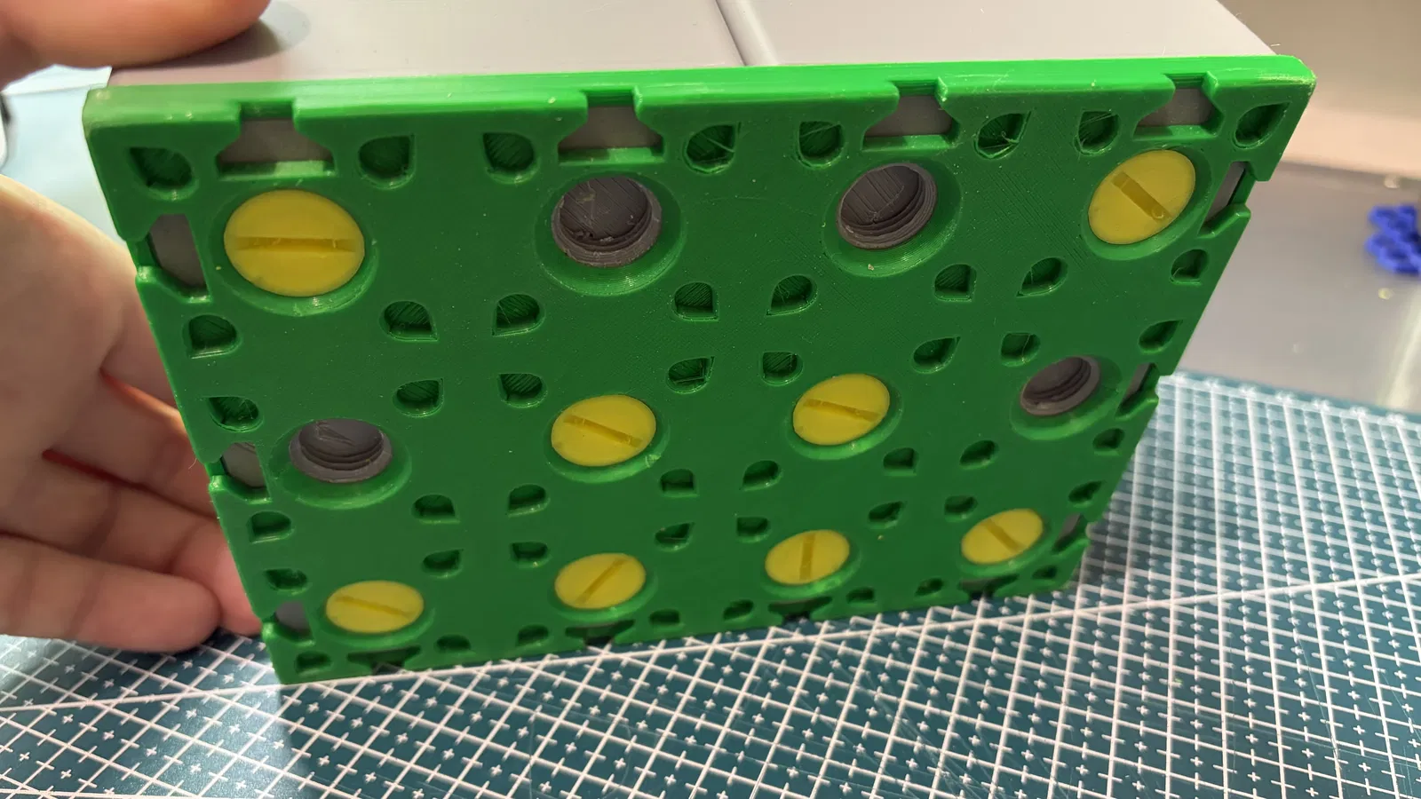 Từng phần gridfinity riêng lẻ được bắt vít vào đế bằng vít in.