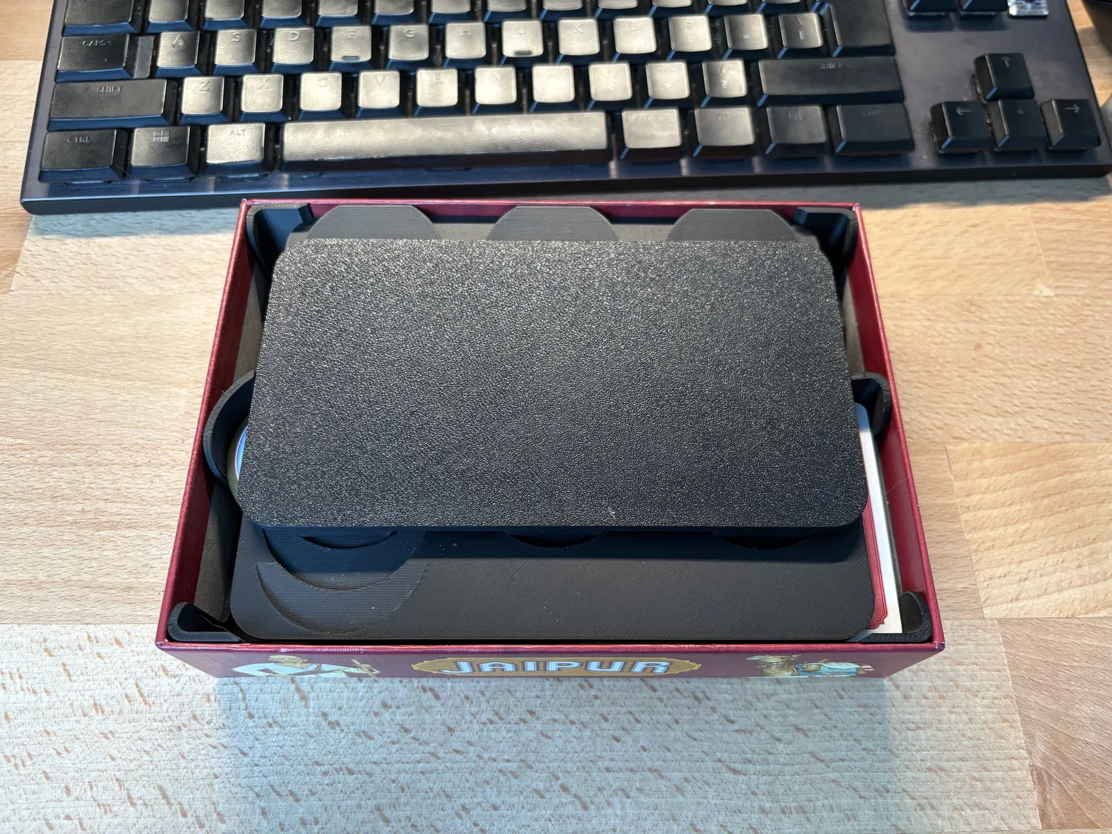 Bộ organizer 2-trong-1 cho board game Jaipur. Đã có nhiều mẫu cho game này rồi, nhưng chưa mẫu nào giải quyết gọn gàng vấn đề setup hơi lằng nhằng: chỉ cần xếp chồng token là sẽ che mất các giá trị token quan trọng. Mình cũng thích giữ board game trong đúng hộp zin của nó.