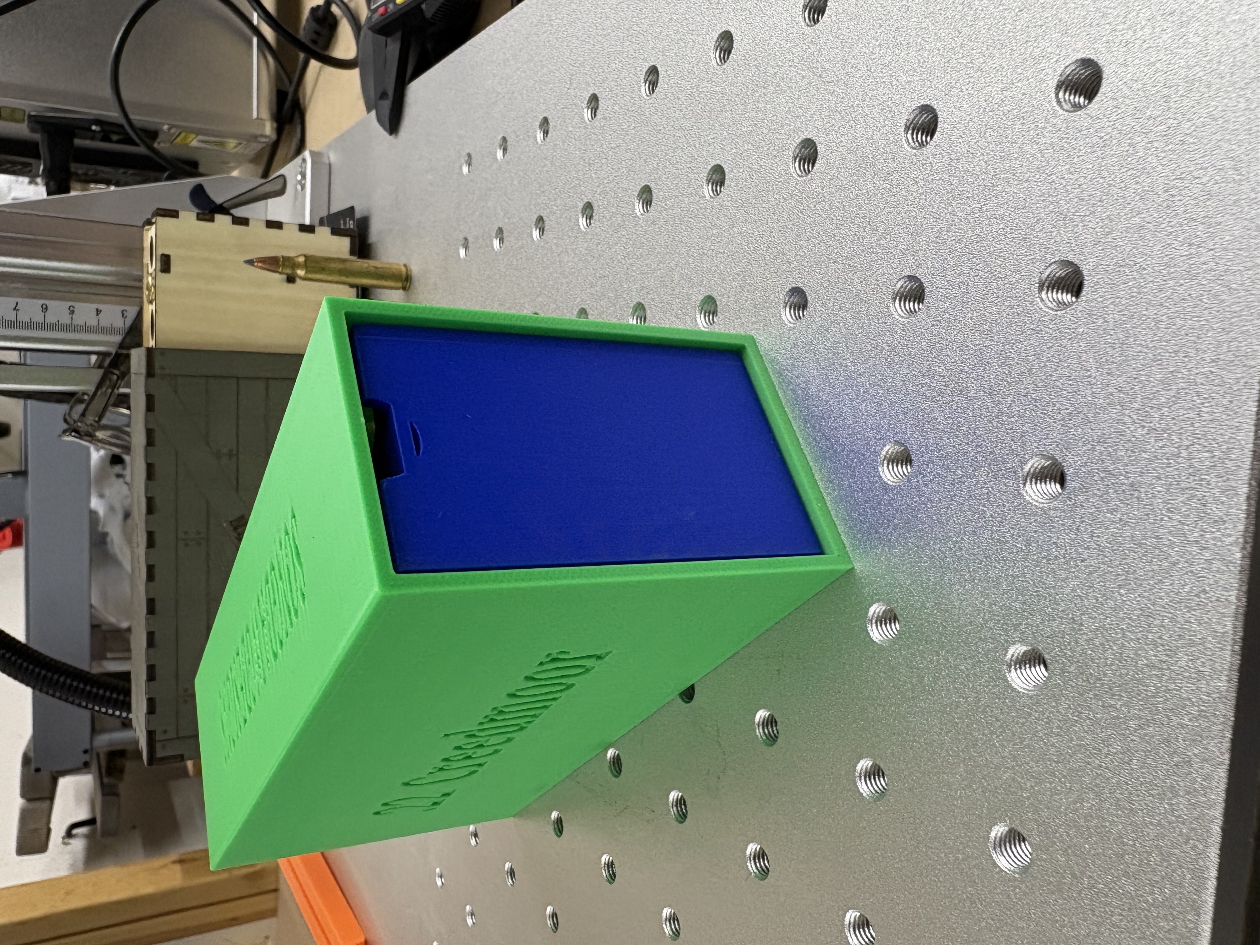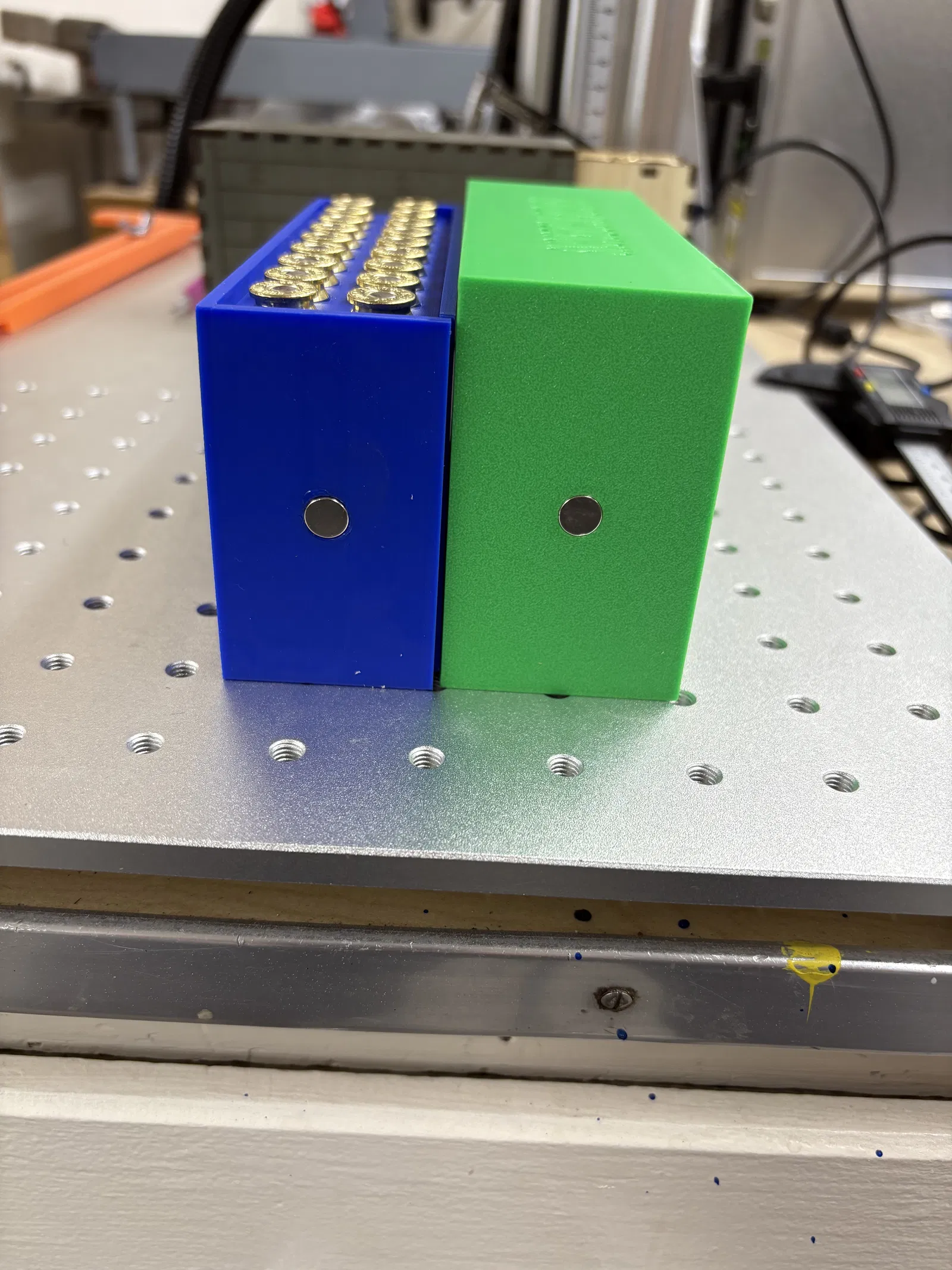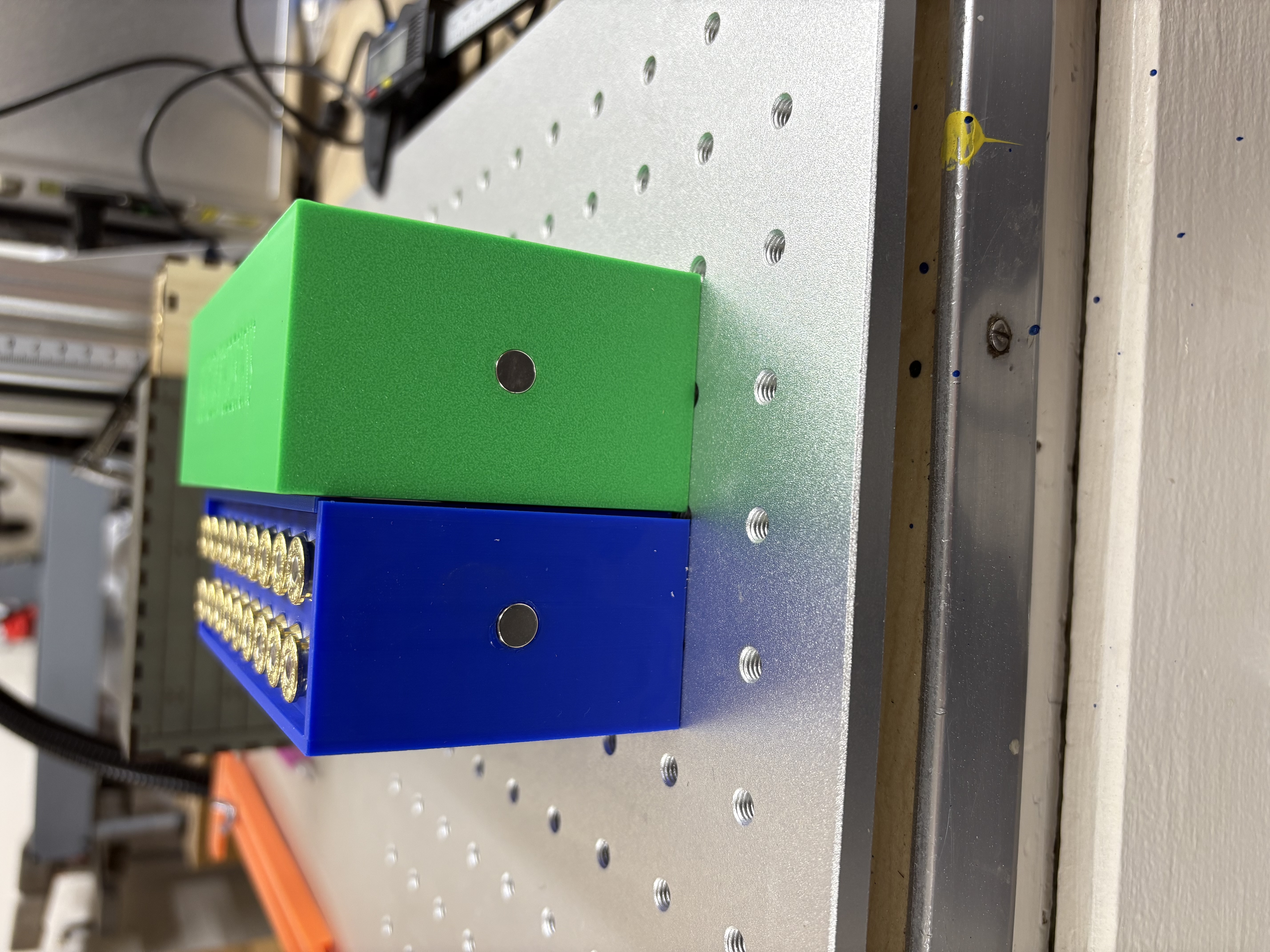 Thiết kế có các khoang bên trong fit chuẩn giúp giữ viên đạn chắc chắn và thẳng hàng. Mỗi chi tiết đều có lỗ lõm tròn phía sau đúng size để gắn nam châm nhỏ, cho phép bạn làm nắp giữ bằng nam châm (magnet-retained lid) để nắp luôn đóng kín khi cất trữ hoặc mang đi.