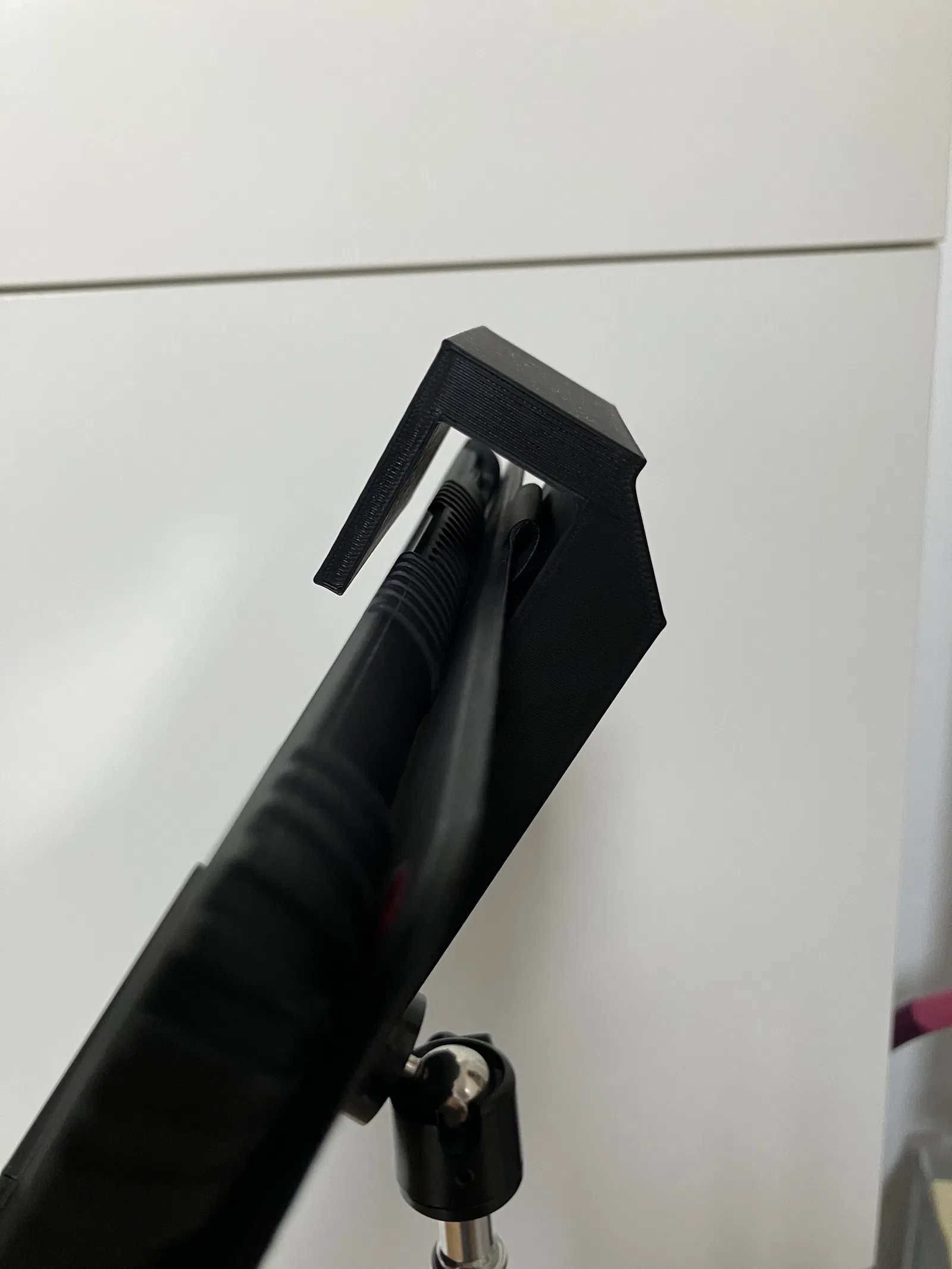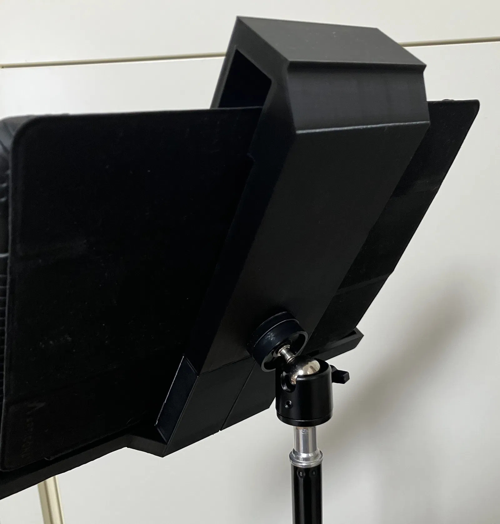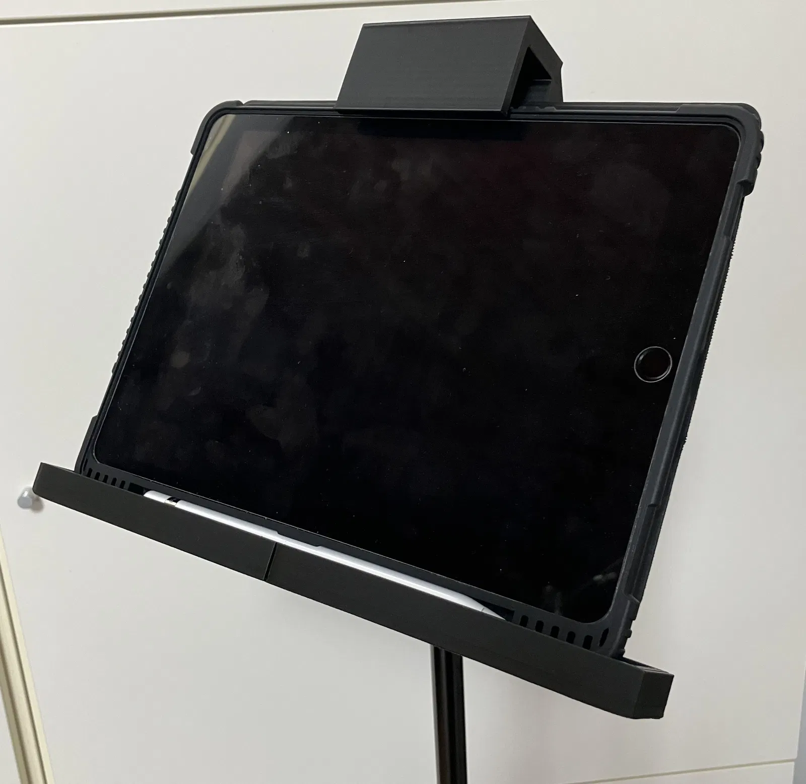 Giá đỡ iPad cho iPad 7 dùng ốp dày (tối đa 23 mm), lắp vào chân đỡ sân khấu. Có STL và file PrusaSlicer chia 3 phần, hướng dẫn tạo vùng 100% infill quanh insert ren; in PLA, 15% infill, organic supports.