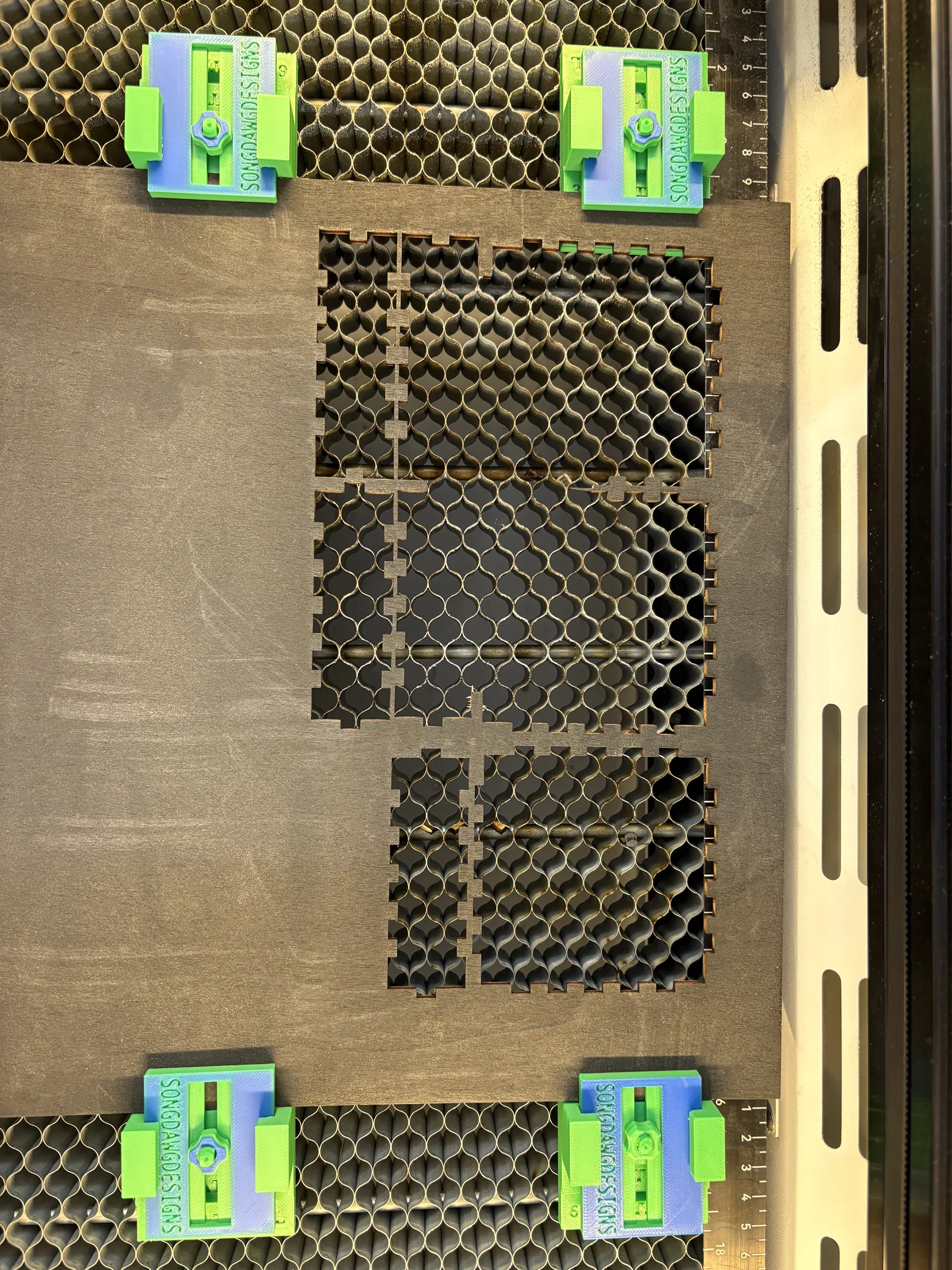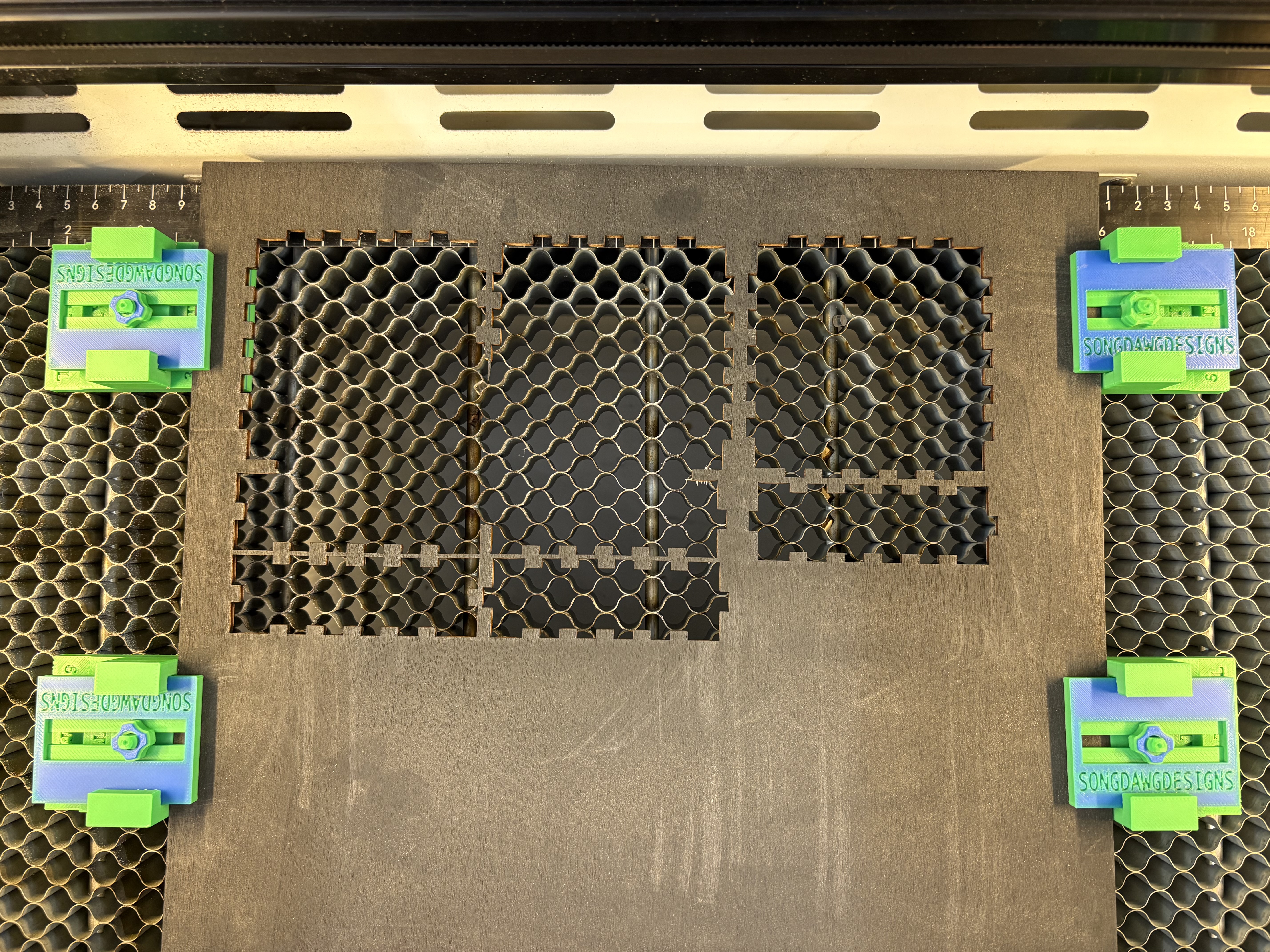 Kẹp giữ vật liệu low-profile cho máy khắc laser, giúp nâng phôi khỏi honeycomb bed để giảm phản xạ, tăng airflow và hạn chế muội. Hỗ trợ độ dày 3–6mm, có tab trượt; tùy chọn dán nam châm 30x3mm. Có file STL & 3MF.