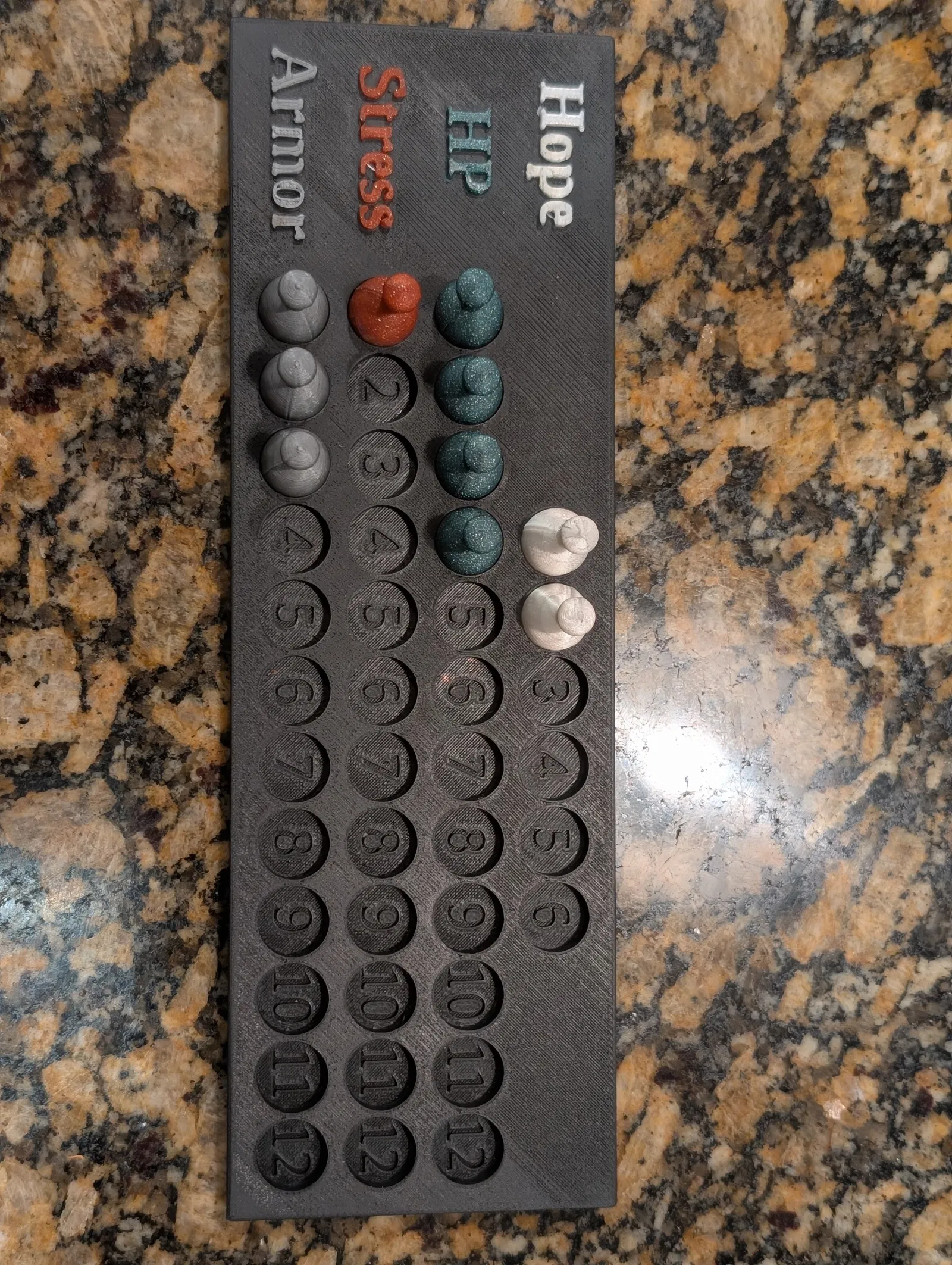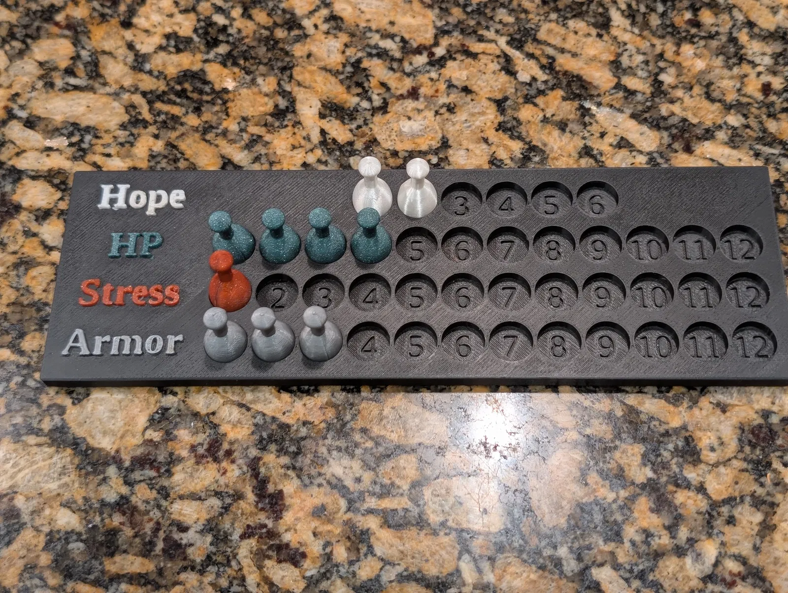 Bộ resource tracker cho TTRPG gồm board và các pieces dạng tham số hoá. File STL chỉ là mẫu tạo từ OpenSCAD; bạn có thể tải .scad để chỉnh text, token hoặc số hàng. In thử với PLA, layer 0.2mm.