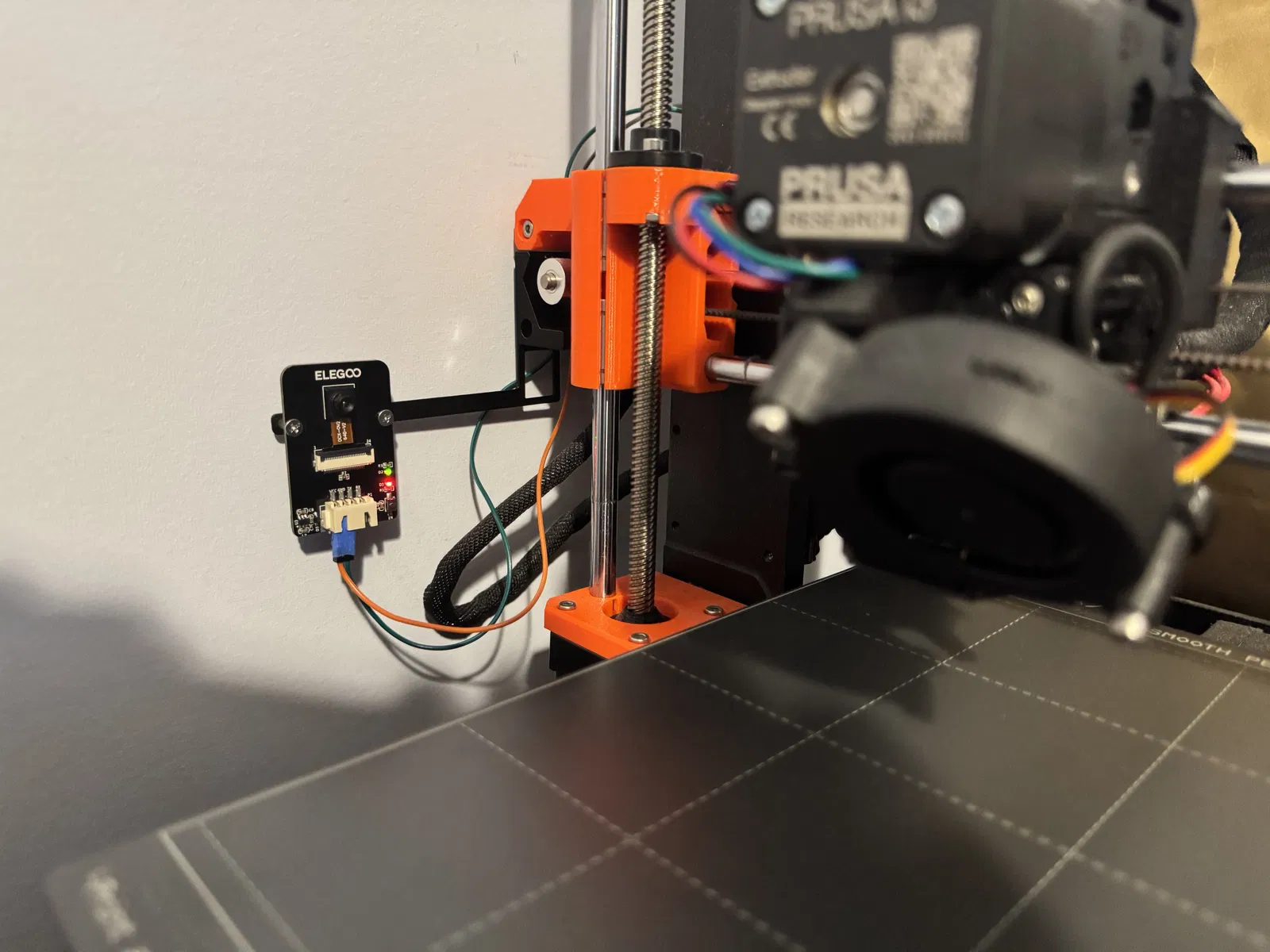 Giá đỡ đơn giản cho ELEGOO ESP32 Wrover Camera gắn lên máy in Prusa MK3/S/+. Lắp bằng 1 ốc M3 18mm, in không cần supports. Có hướng dẫn đi dây cấp nguồn và xem feed qua WiFi tại 192.168.4.1.