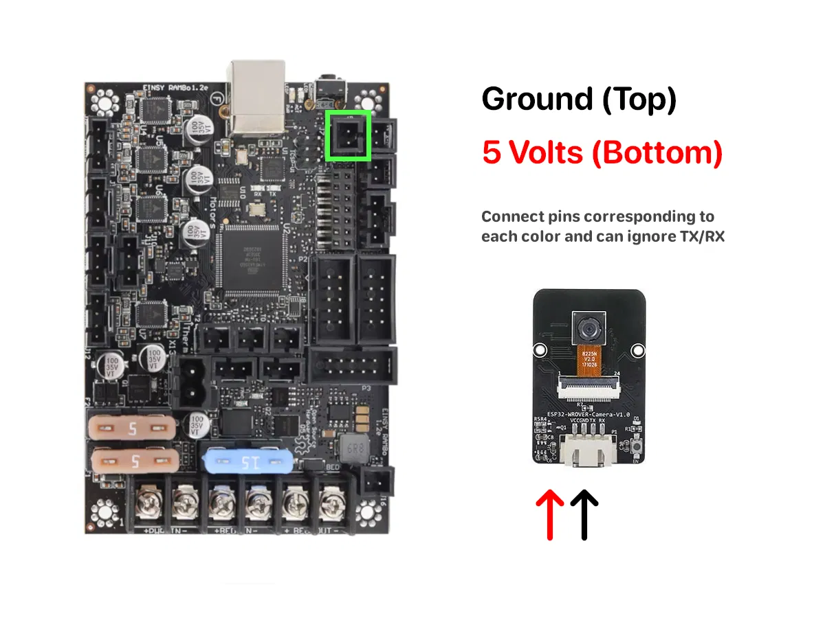 Để cấp nguồn cho camera, bạn có thể dùng trực tiếp cổng USB-C, nhưng lưu ý đầu còn lại của dây phải là USB-A thì mới hoạt động ổn. Tuy nhiên, mình khuyên nên dùng dây jumper, làm theo hướng dẫn ở hình cuối để đấu cực dương và cực âm. Luồn dây lên và ra khỏi vỏ case, rồi đi tới camera, nhớ chừa một chút độ rơ để dây không bị vướng/kẹt. Cách này giúp camera chỉ bật khi máy in đang bật.