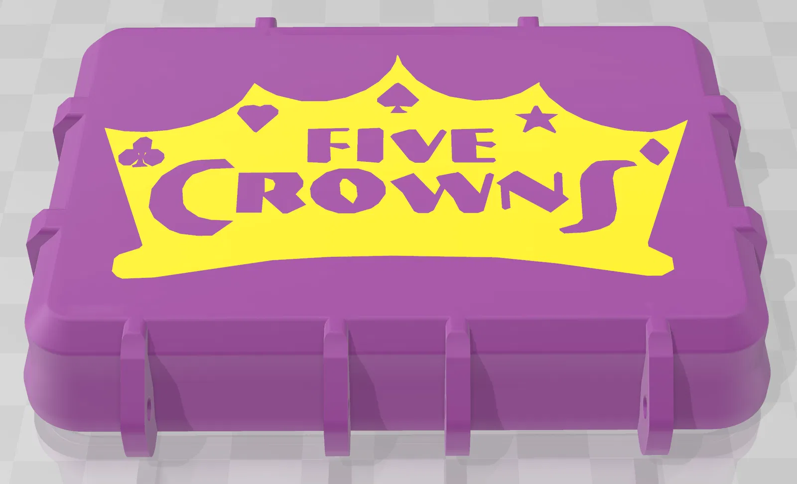 Nắp hộp cho game bài Five Crowns, remix từ Uno Box để bỏ logo dập nổi và thay bằng logo Five Crowns. Tương thích với đáy Uno Box loại sâu hơn và gasket seal theo các link đính kèm.