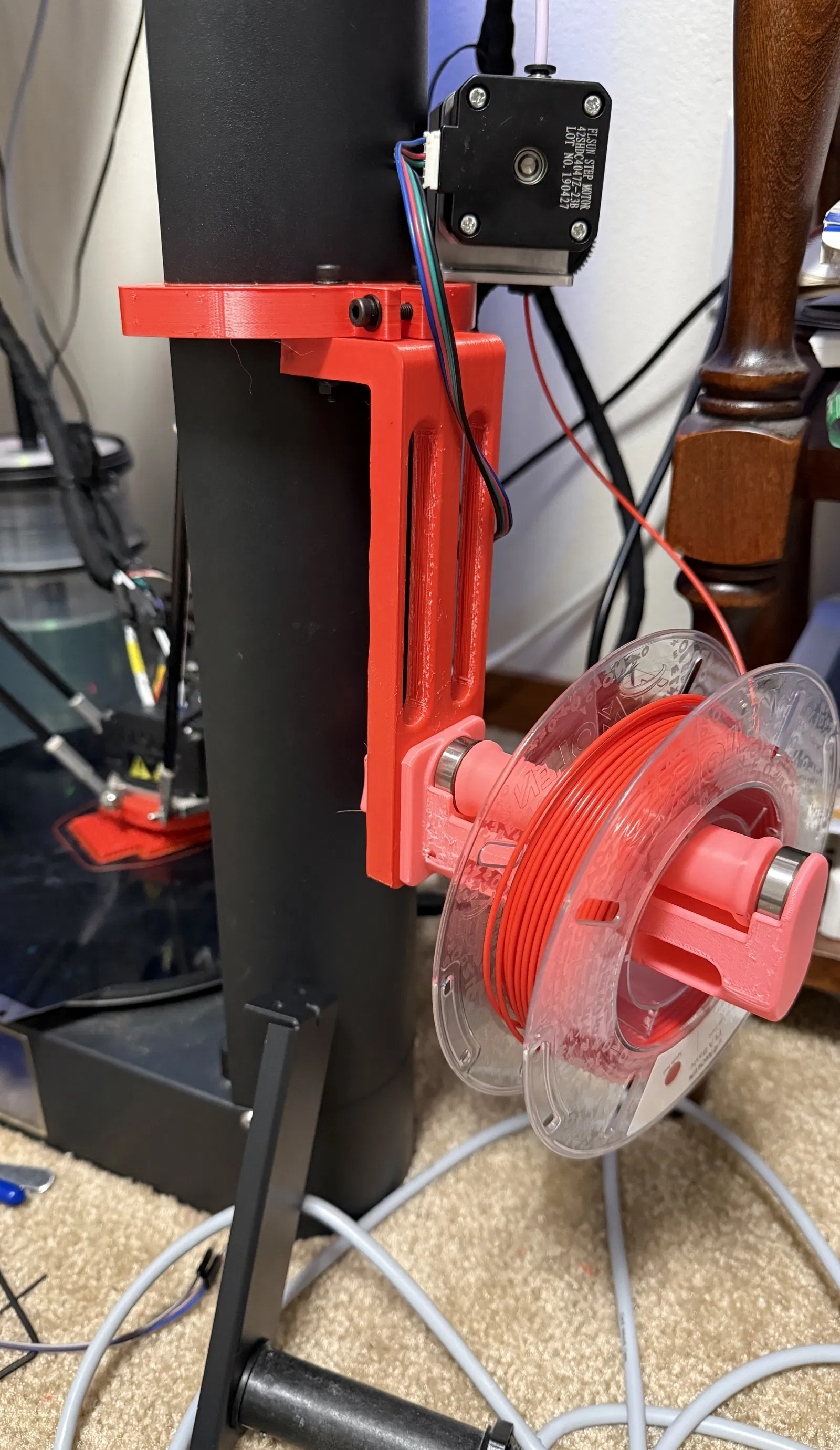 Mình phải dời cái extruder từ trên đỉnh máy in xuống bên hông — chuyện dài dòng mà chắc cũng không ai ở đây quan tâm. Thành ra mình cũng cần gắn luôn cái filament holder / roller qua bên hông để có góc PTFE đẹp nhất, giảm tối đa lực căng và áp lực lên hệ thống.