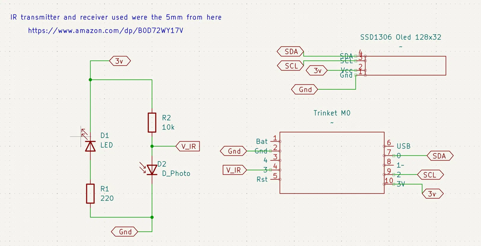 Đây là phần vỏ (case) cho một món gadget đo/đếm shutter speed. Mình dùng Adafruit Trinket M0, màn hình SSD1306 OLED I2C, và bộ phát IR 5mm + cảm biến (photodiode) 5mm loại phổ thông.
