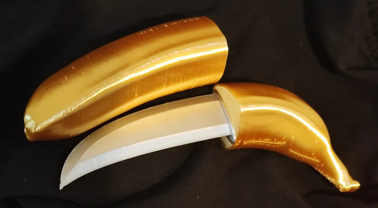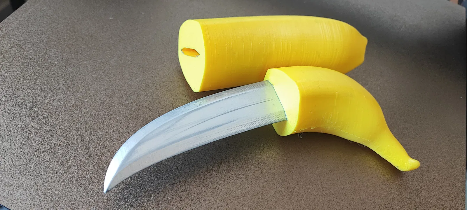 Phiên bản “banana-knife” của mình: một con dao ngụy trang thành trái chuối, dùng 4 nam châm 6x2mm. Từ MkI (PLA+/resin) đến MkIII với fit tốt hơn, nam châm giấu kín và tang lưỡi cải tiến.
