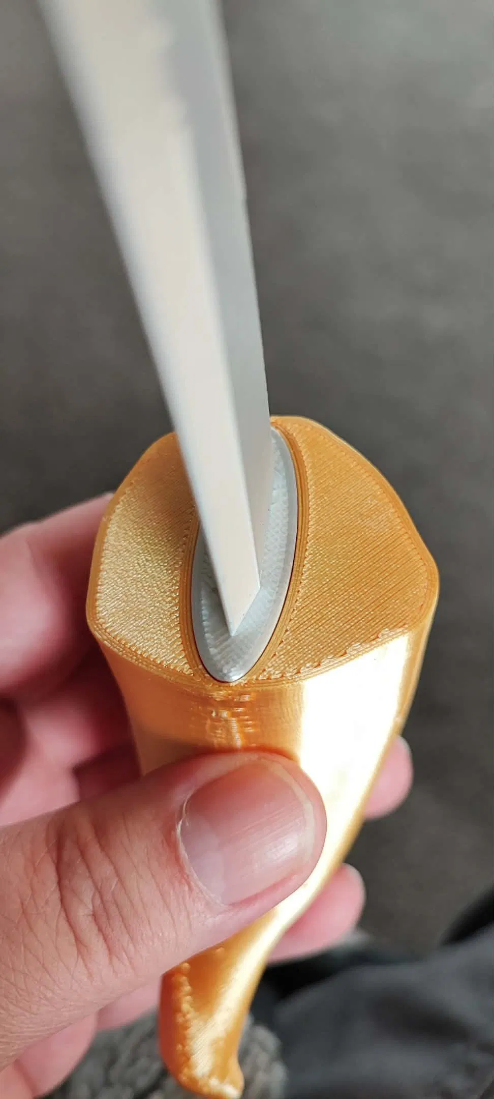 Xmas ’25 thì mình chỉ muốn lưỡi dao xịn hơn. Và sau vụ “Goose-knife” (nghe không lộn đâu), mình nảy ra ý tưởng làm phần tang tốt hơn để gắn lưỡi vào vỏ. Với lại mình cũng cải thiện kỹ thuật để fit tổng thể tốt hơn, kiểu mình học được cách offset faces các kiểu; trước đó mình toàn làm kiểu… giảm kích thước lưỡi chút xíu trong slicer để tạo khe hở cần thiết, vì cái rãnh trong model là cắt y chang kích thước lưỡi. Không ổn tí nào. Vậy là banana-knife MkIII — phiên bản “cuối cùng cũng thấy tự tin để đăng” — ra đời.