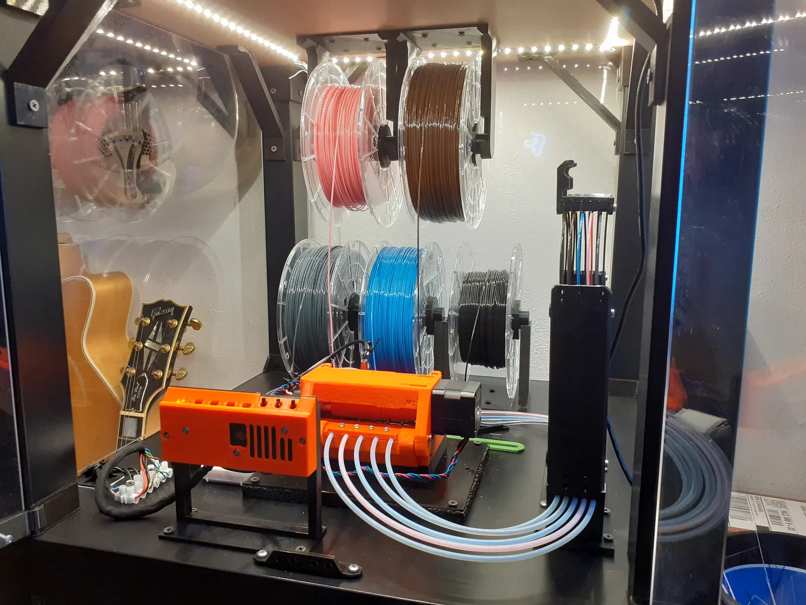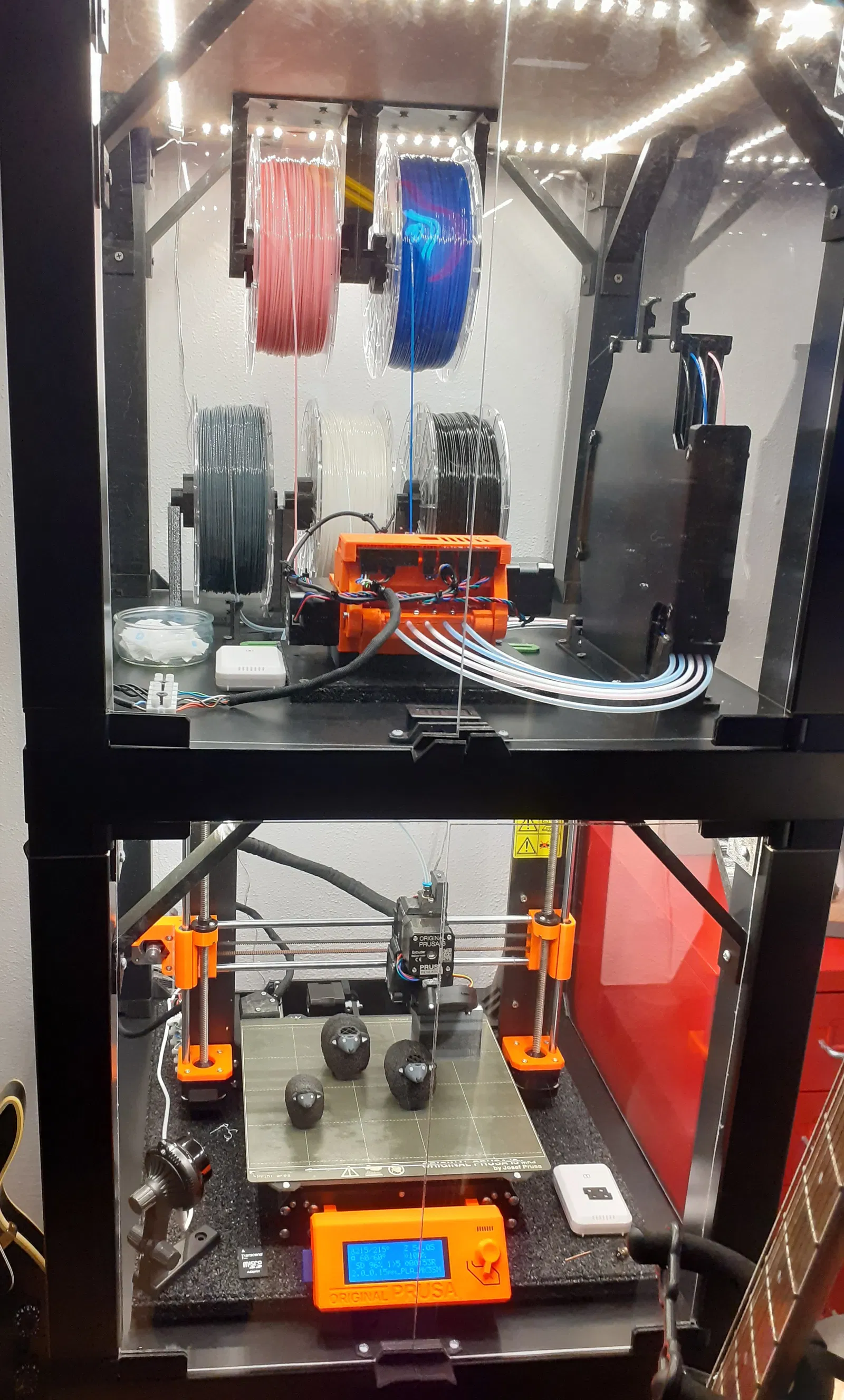 Enclosure cho MK3S và MMU2S với thiết kế ưu tiên thao tác nhanh khi MMU bị kẹt (jam). Cho phép dễ tiếp cận khu vực MMU; lưu ý có thể cần nới/dài dây cáp MMU về máy và chọn đúng tiết diện dây.