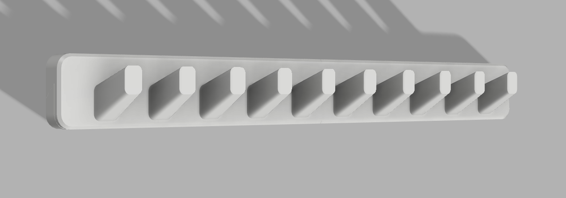 Móc treo áo kiểu French cleat. Có hai gờ/điểm định vị (registration) trên mỗi nửa của móc treo để đảm bảo nó luôn chắc chắn, không bị trượt theo trục X. Thiết kế che đầu vít và giúp bạn dễ dàng dời/chỉnh vị trí các móc nếu muốn.