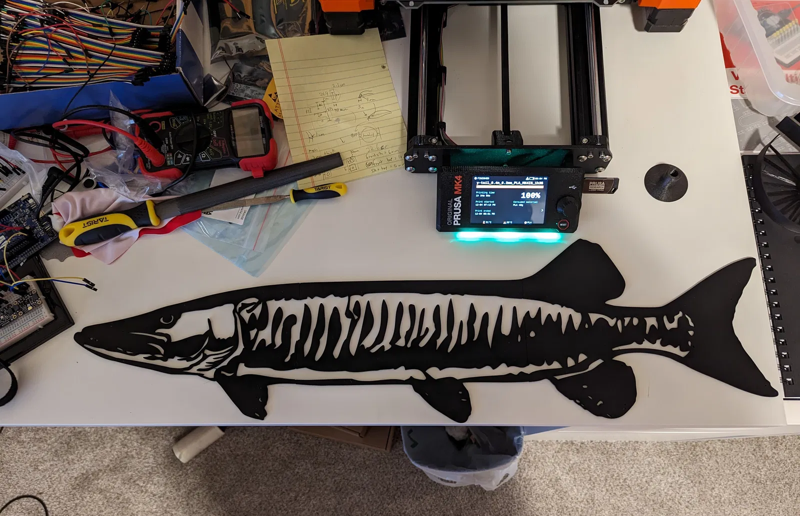 Silhouette cá Muskellunge dựa trên hình ảnh DNR kinh điển của “musky”. Mẫu chia 3 mảnh để in riêng, sau đó dán/keo ghép lại thành một hình bóng cá hoàn chỉnh, hợp trang trí kiểu cabin/bờ hồ.