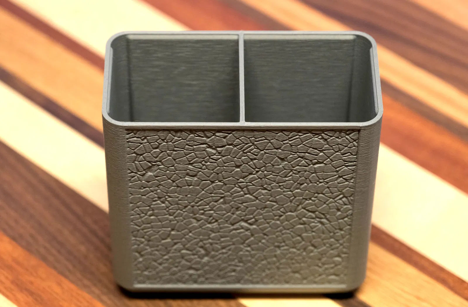 Stoney Pencil Cup với các panel bề mặt kiểu đá, tạo bằng FreeCad rồi thêm texture trong Blender. Dù nhiều geometry (đã decimate còn ~600k faces), in ra vẫn cứng cáp và rất đáng, nhất là khi dùng PLA marbled màu bê tông.