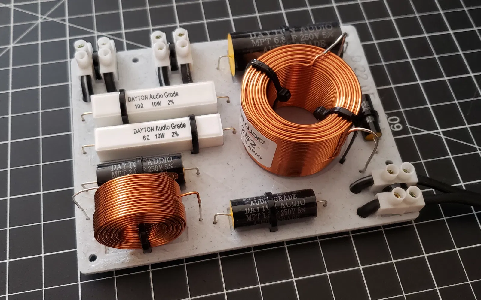 Board in 3D giúp bố trí linh kiện và đi dây crossover cho loa bookshelf Overnight Sensation. Dùng terminal blocks, vị trí linh kiện có nhãn rõ ràng và có sơ đồ wiring ở mặt dưới để lắp ráp, hàn nối nhanh hơn.