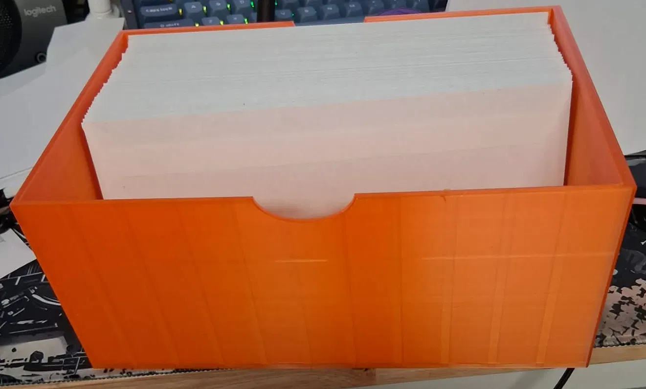 Hộp đựng phong bì cỡ Number 10 có nắp, giúp mang phong bì ra bưu điện gọn gàng, không bị trượt xộc xệch. Thiết kế trên Tinkercad, có lỗ trên nắp để dễ nắm/kéo phong bì khi đầy.