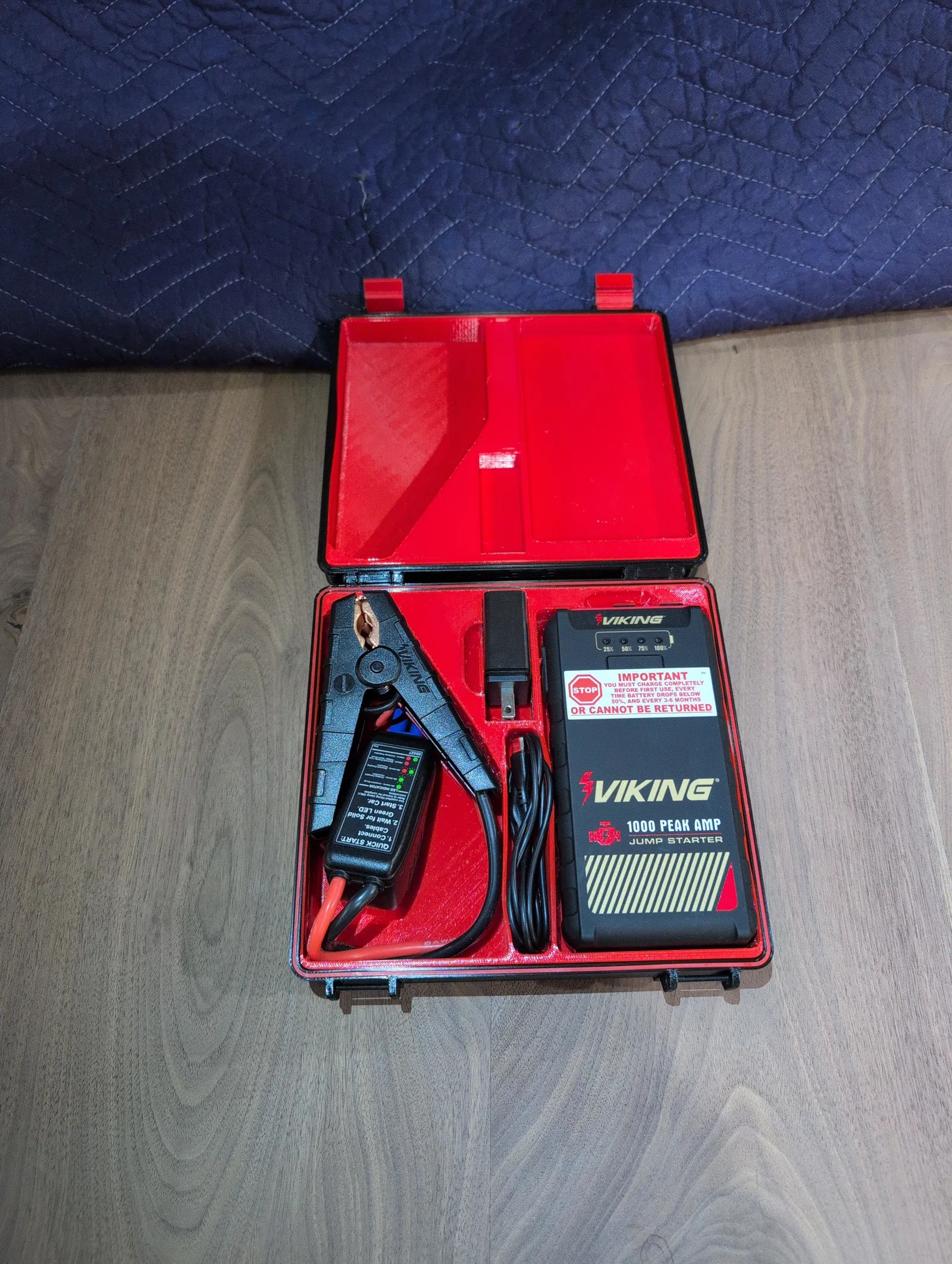 Hộp rugged in 3D cho Harbor Freight VIKING 1000 Peak Amp Lithium-Ion Jump Starter [59527], kèm insert tùy biến để giữ máy, dây cáp, cục sạc và dây sạc. Hộp đóng khít, hạn chế rung và đã test thả rơi ~3 feet.