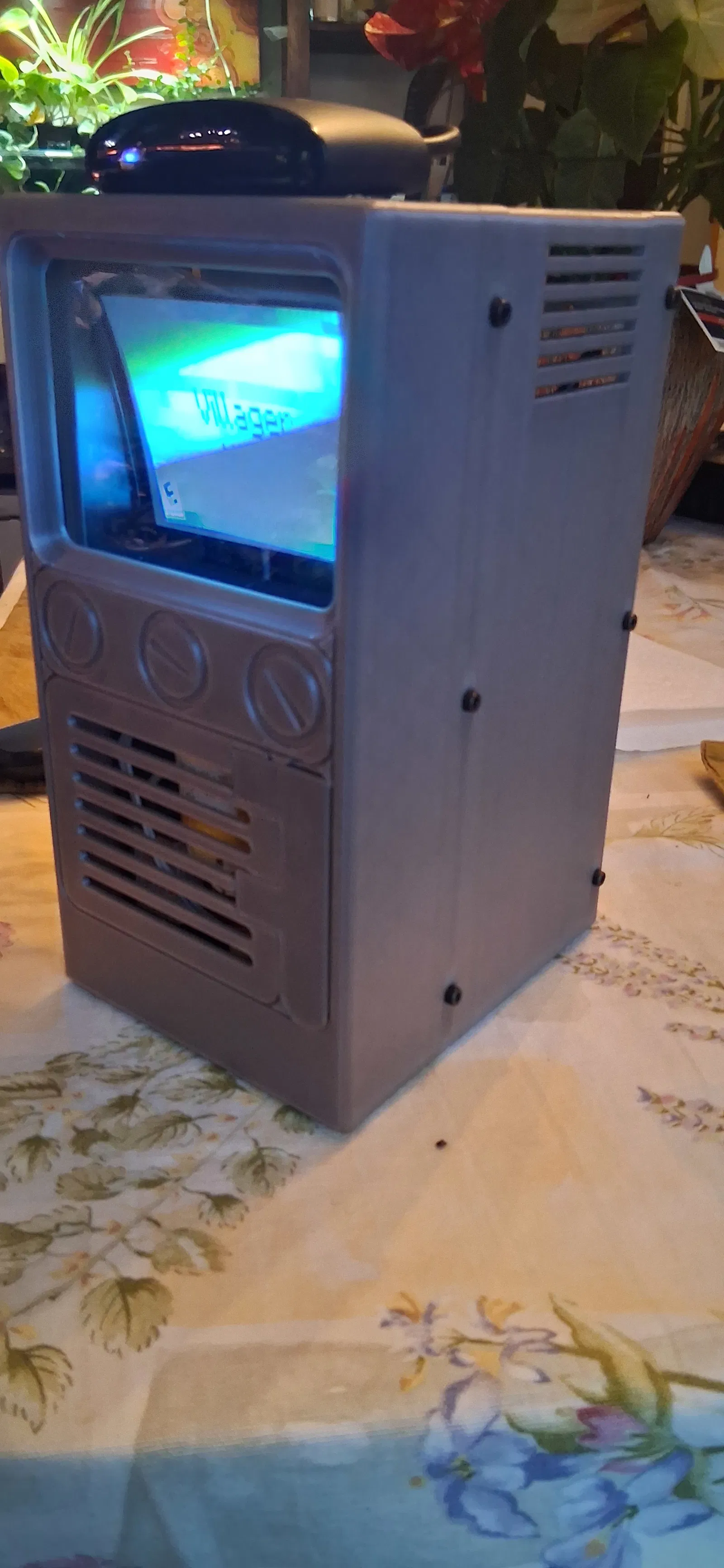 Mẫu vỏ cho màn hình CRT 4" mua trên Amazon, có chừa không gian để gắn pin, loa và linh kiện phụ. Lắp ráp đơn giản: cố định CRT bằng 6 ốc M3x12, bố trí loa phía sau và đặt Roku lên trên housing chính.