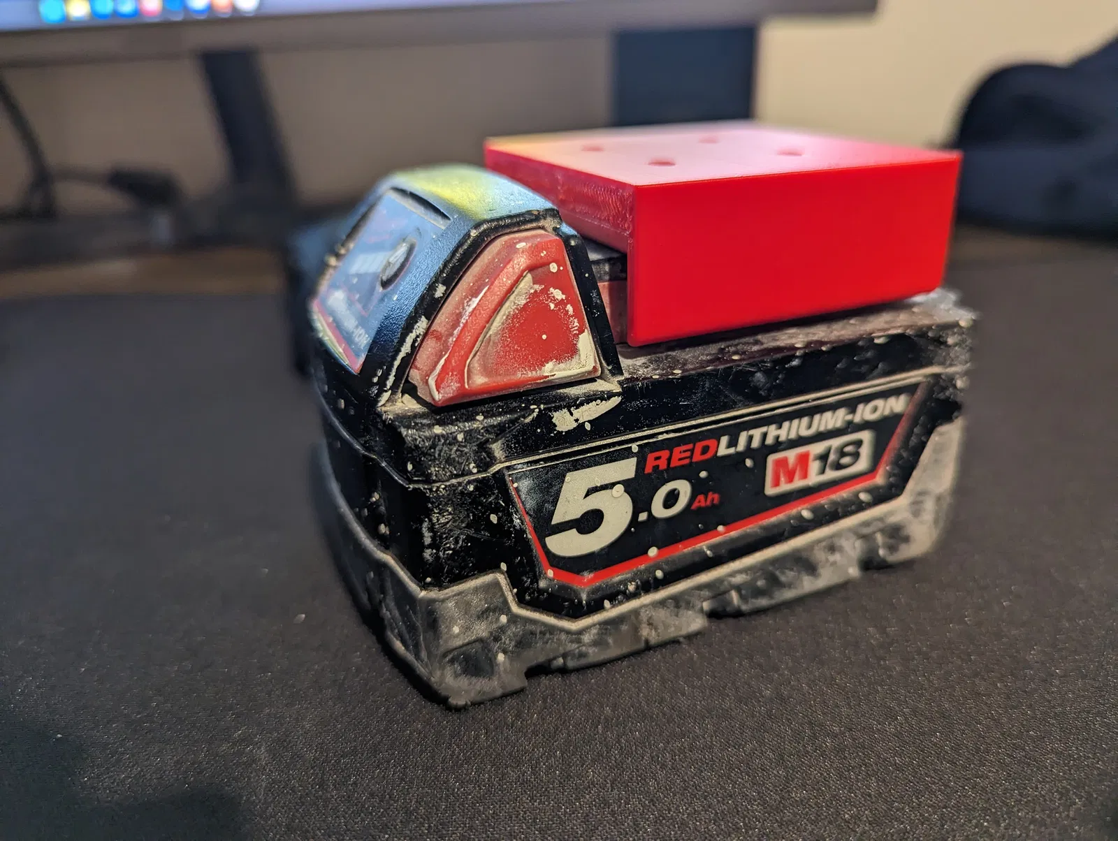 Giá đỡ pin Milwaukee M18 dạng trượt vào, không có clip để tháo nhanh hơn. Thiết kế nhỏ gọn, không cần supports và in nhanh. Khuyến nghị ABS (4 perimeters, 20% infill); cũng dùng PETG hoặc PLA nếu không gặp nhiệt.