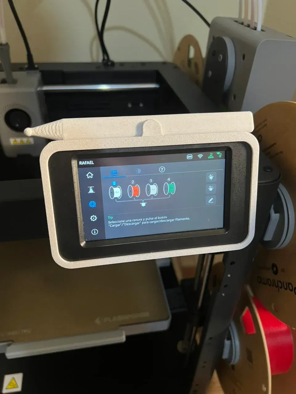 Mẫu 3D gồm bezel tùy biến và stylus cho Flashforge AD5X. Bezel làm máy gọn đẹp hơn và có chỗ để stylus tiện lợi. Stylus giúp thao tác touchscreen chính xác, giữ màn hình sạch; bản cải tiến bền và ổn định hơn.