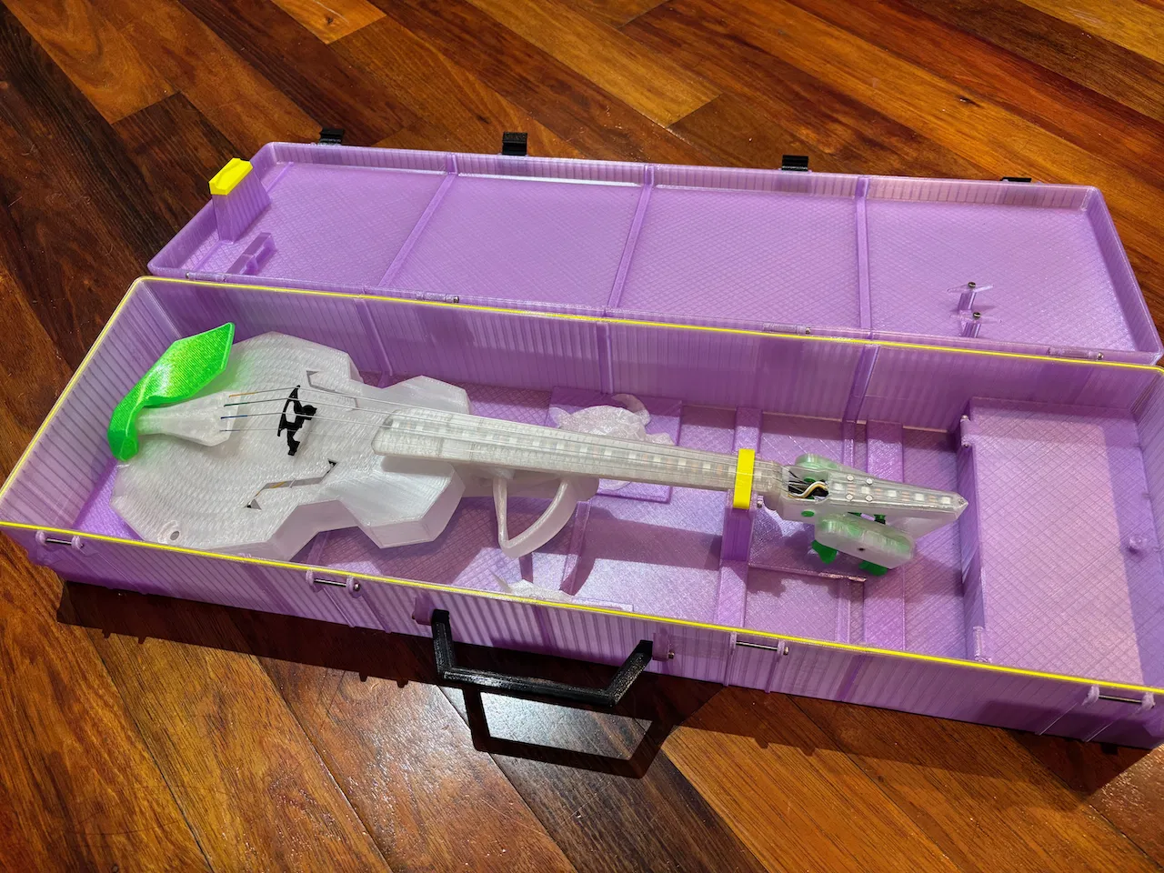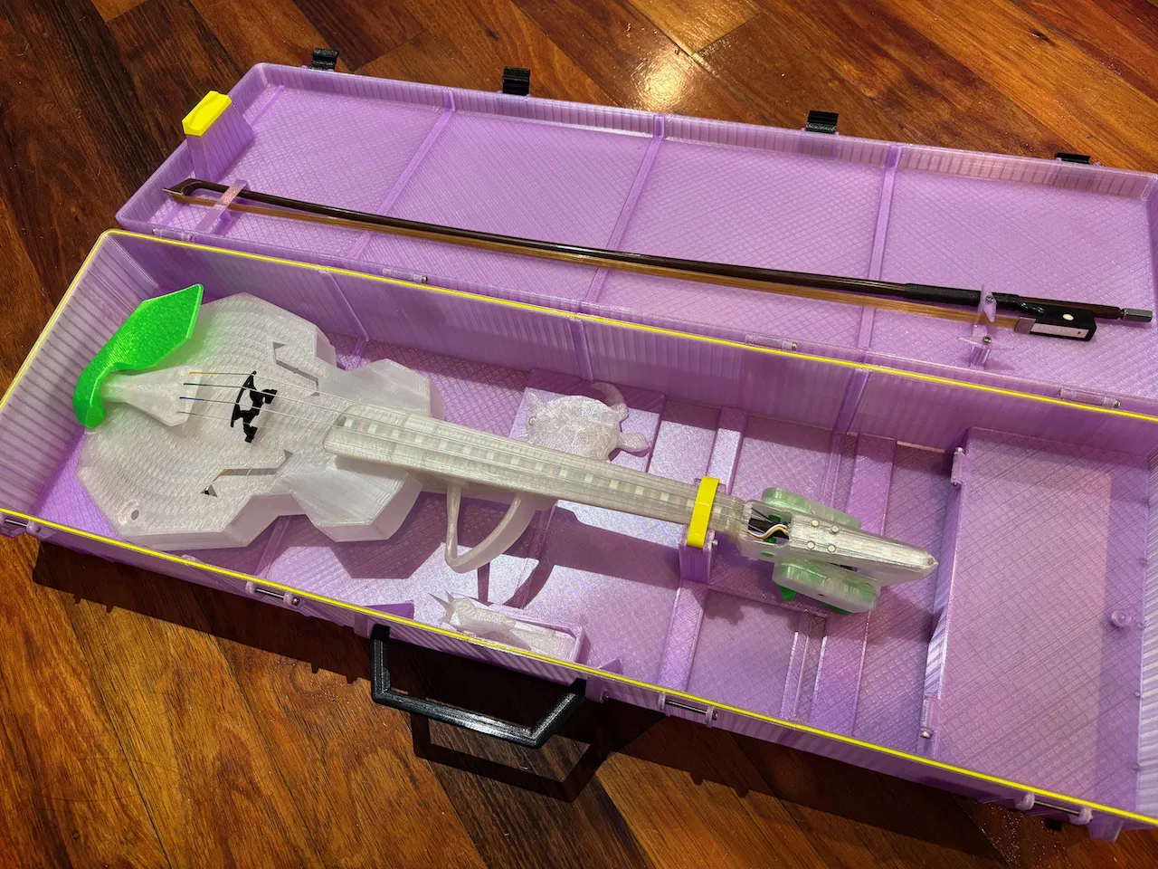 Mình làm cây Modular Fiddle 4 String V4 nhưng bất ngờ là không có cái case đàn Violin nào có sẵn cho nó (hay cho Violin tiêu chuẩn). Vợ mình (nghệ sĩ violin chuyên nghiệp) nói cây Fiddle cho âm thanh khá ổn và cô ấy cần mang đi lại với nó. Đây là một bản remix nhanh từ Parametric Rugged box để vừa cây Fiddle và cả cây vĩ (bow) tiêu chuẩn.