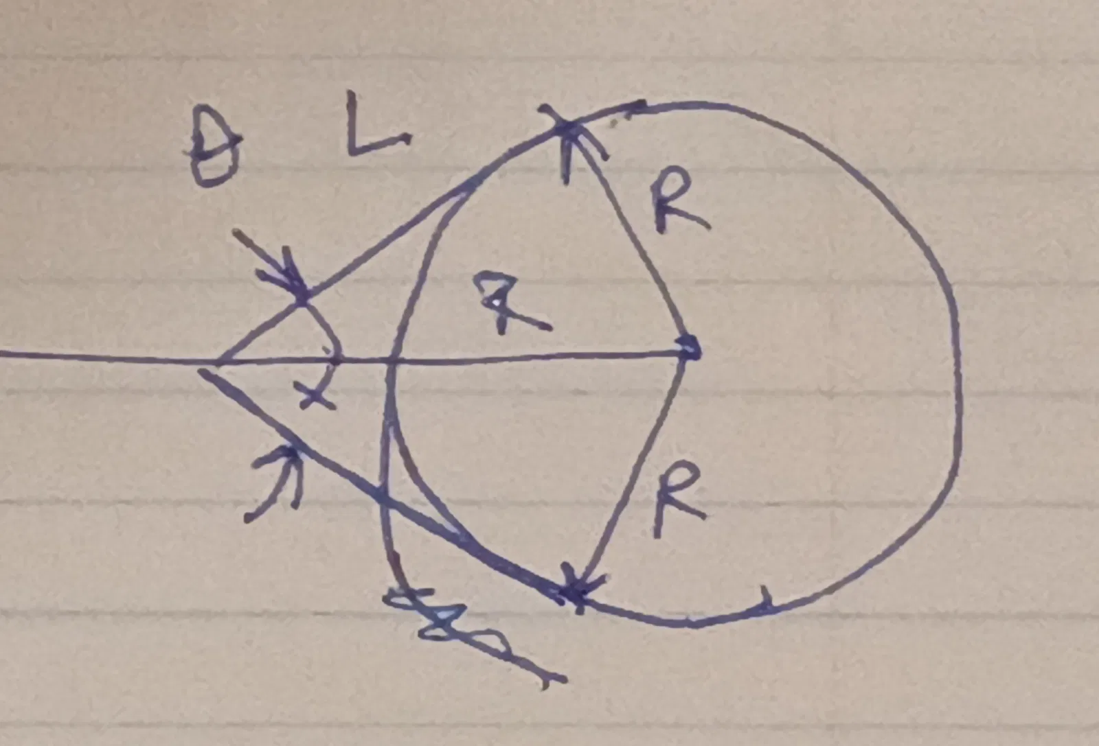 Có một hình để bạn nhìn theo. R là bán kính đang đo, x là khoảng cách giữa đỉnh (apex) của hai chân và bề mặt thân, và L là khoảng cách dọc theo hai chân tới điểm tiếp tuyến (tangent point) với bề mặt thân. Theta là góc tổng của dụng cụ. Mình dùng biến R_over_x làm tỷ lệ giữa bán kính và khoảng cách đo được.