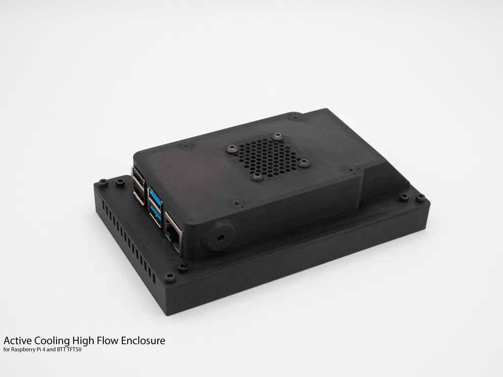 Thiết kế vỏ dạng ducted nhẹ, tối ưu luồng gió để làm mát cả Raspberry Pi 4 và màn BTT TFT50 (2.0/2.1). Dùng trụ M2.5 đi kèm TFT50 (hoặc dài 17mm), hỗ trợ lỗ bắt M3 tùy chọn.