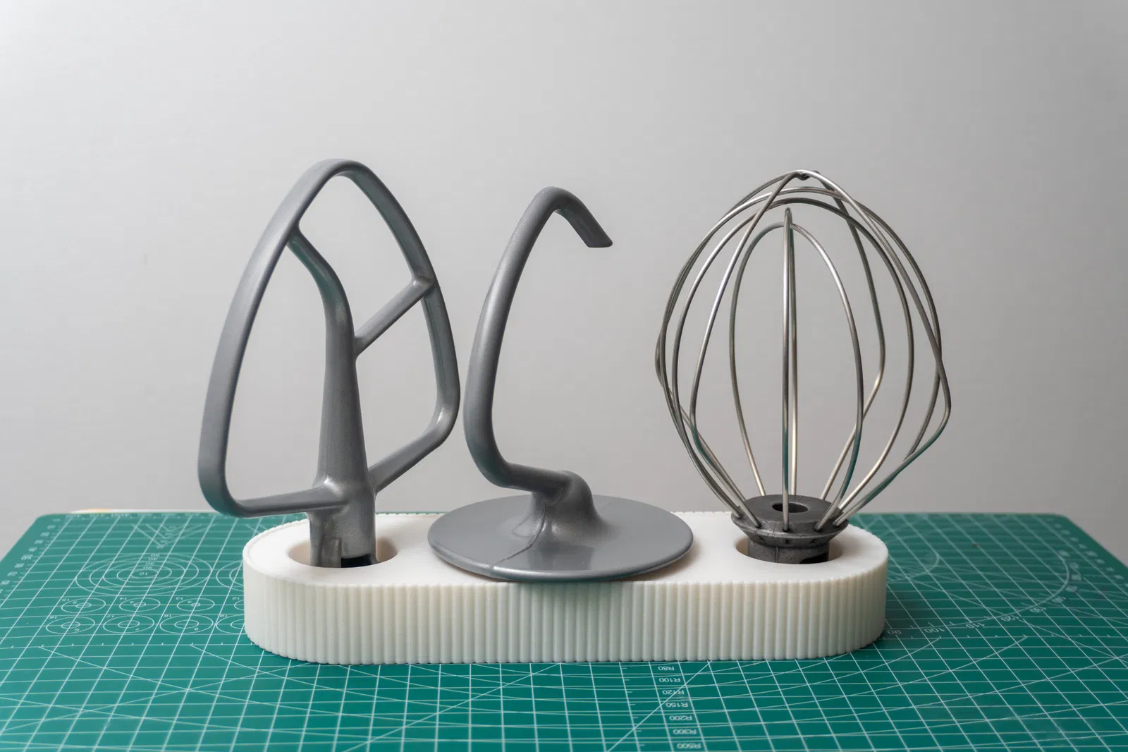 Kệ để phụ kiện Kitchenaid với 3 khe vừa khít cho dough hook, whisk và paddle. Có thể dán thêm chân cao su tự dính dưới đáy để chống trượt, giúp sắp xếp phụ kiện gọn gàng hơn.