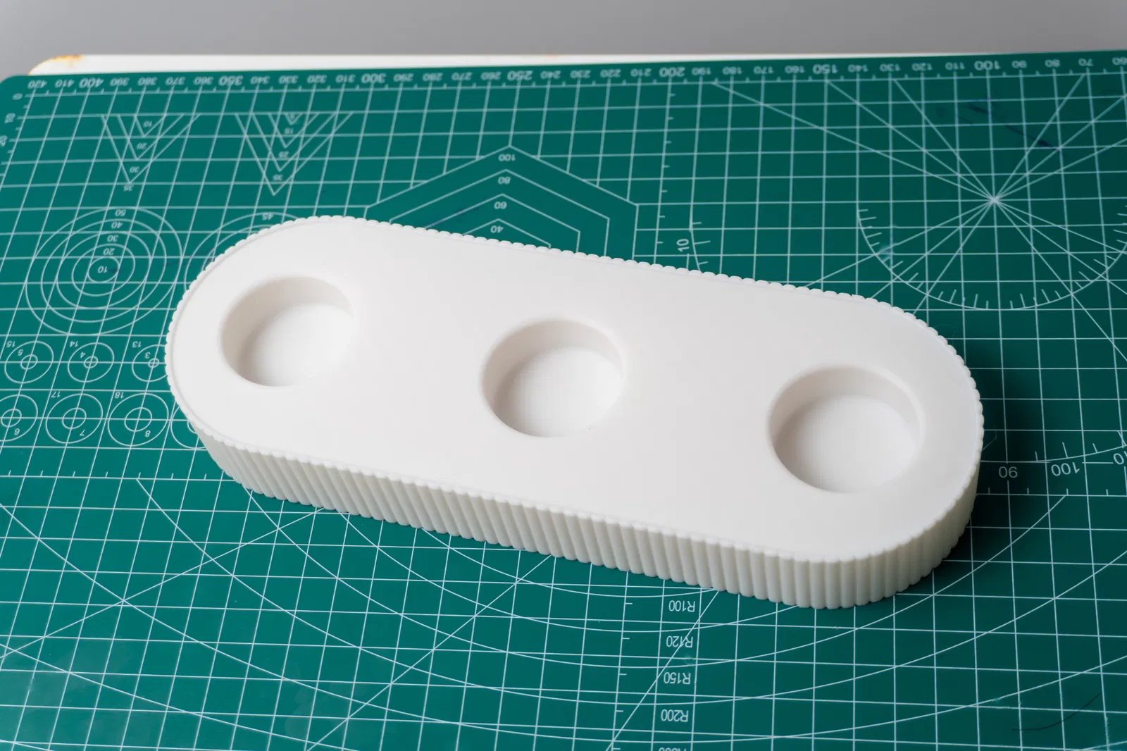 Kệ đơn giản với 3 khe, vừa khít cho các phụ kiện của Kitchenaid như móc nhồi bột (dough hook), cây đánh trứng (whisk) và mái chèo (paddle). Không bắt buộc, nhưng mình khuyên nên dán thêm vài miếng chân cao su tự dính ở đáy để kệ không bị trượt.