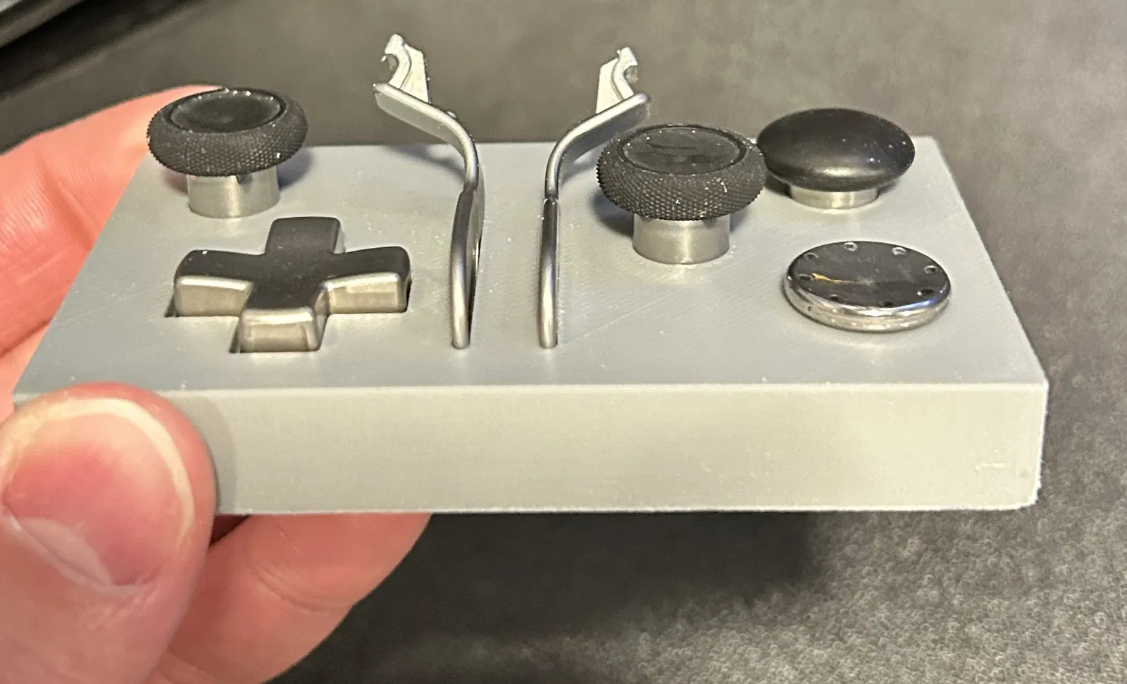 Một cái giá nhỏ để giữ D-pad và thumbsticks dự phòng, kèm khe cắm cho 2 rear triggers của Xbox Elite Controller (bản gốc). Giúp để phụ kiện gọn gàng, dễ lấy và khỏi thất lạc.