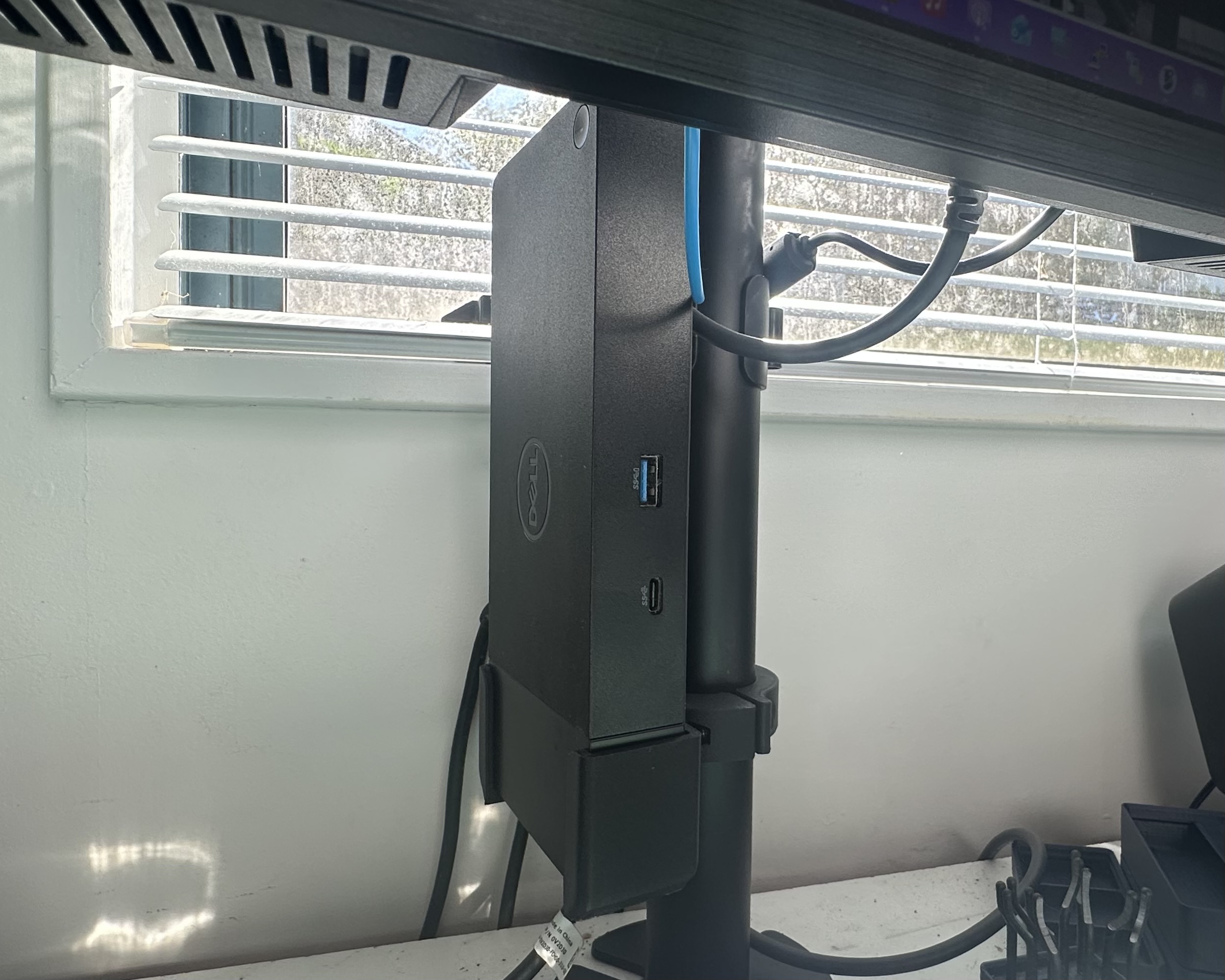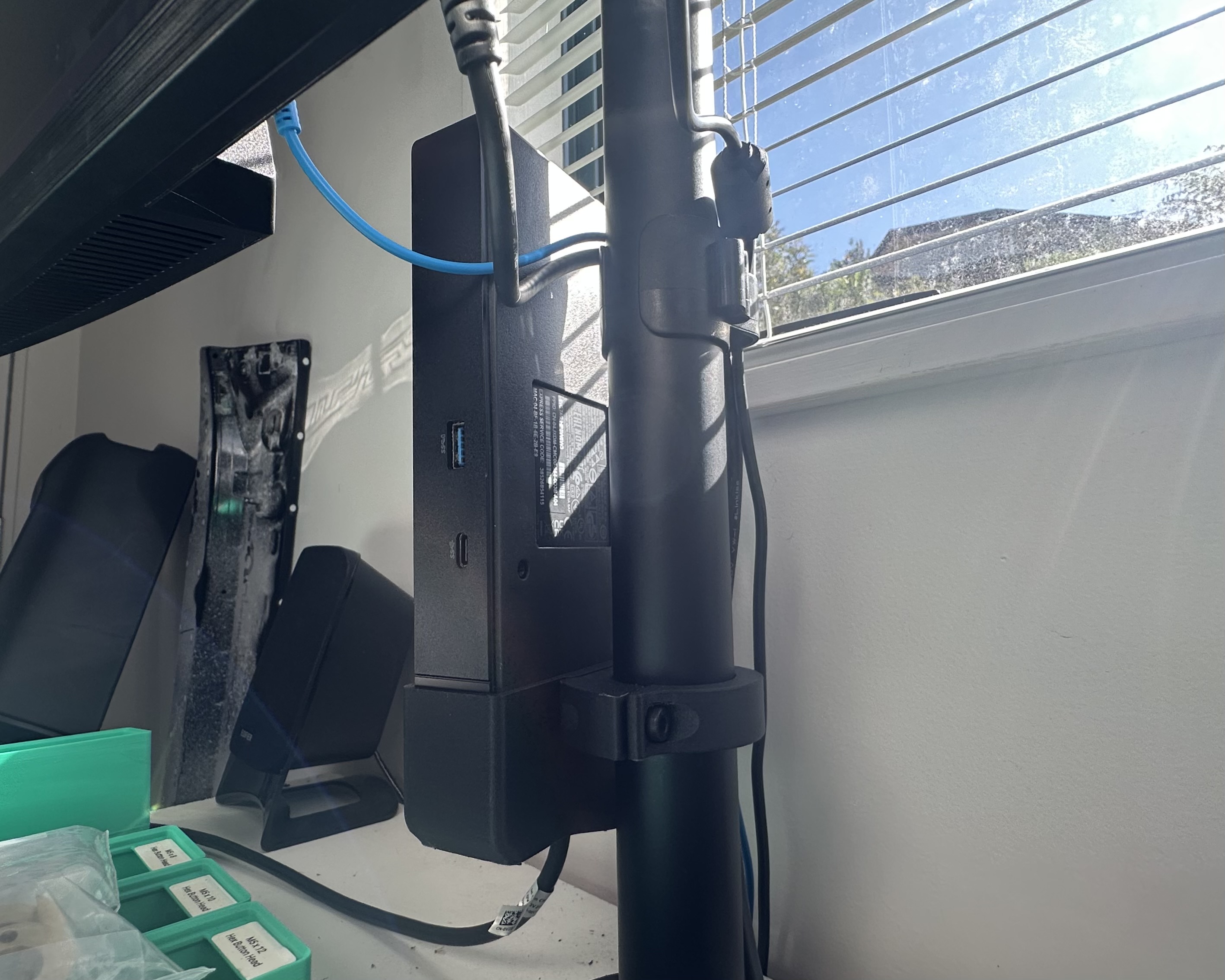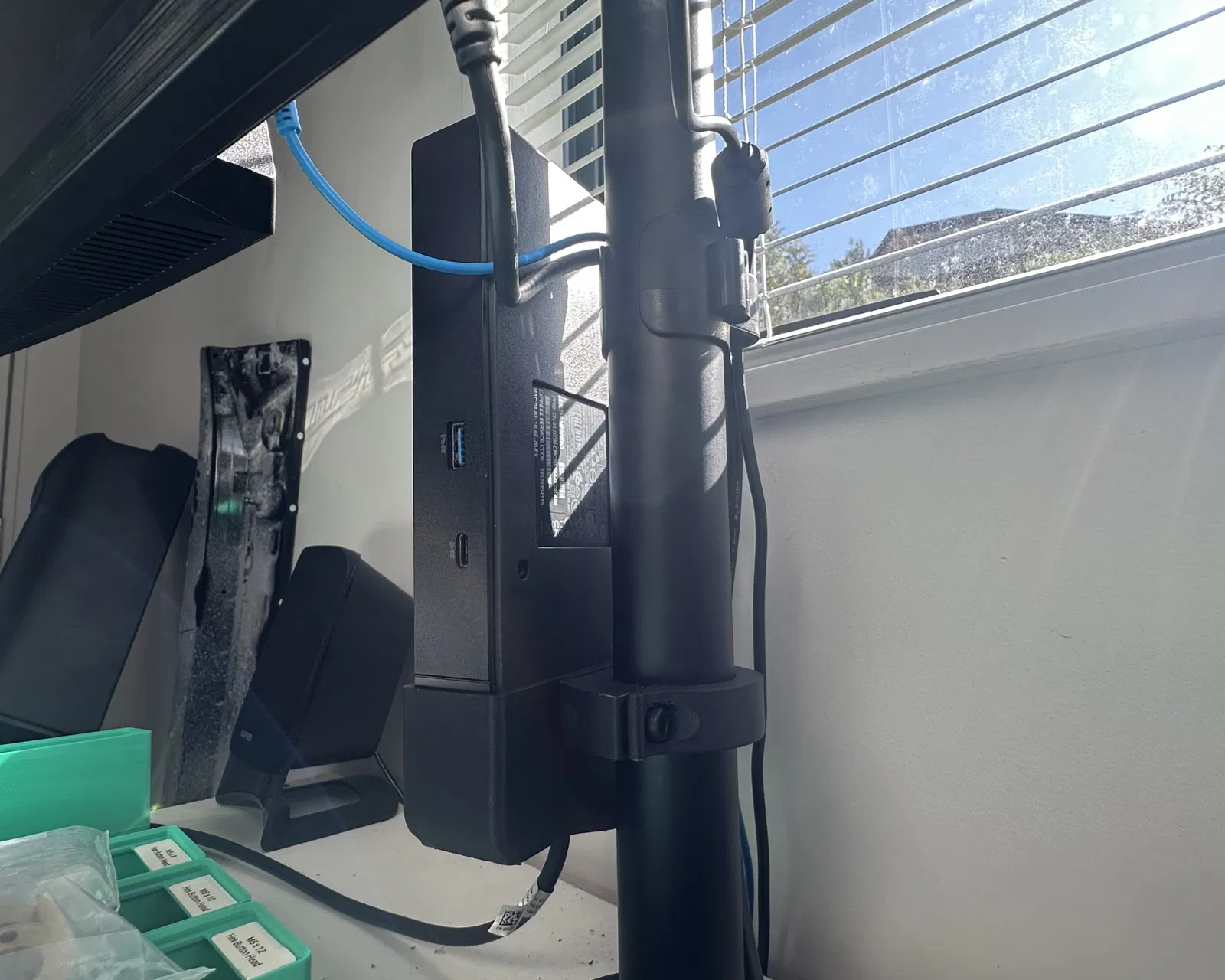 Ngàm (clamp) giúp gắn Dell WD19S Dock lên ống trụ chân màn hình (ống 35D), dọn gọn dây và làm bàn làm việc sạch sẽ hơn. Có kèm file F3D để chỉnh theo đường kính ống khác; in PETG, không cần supports.