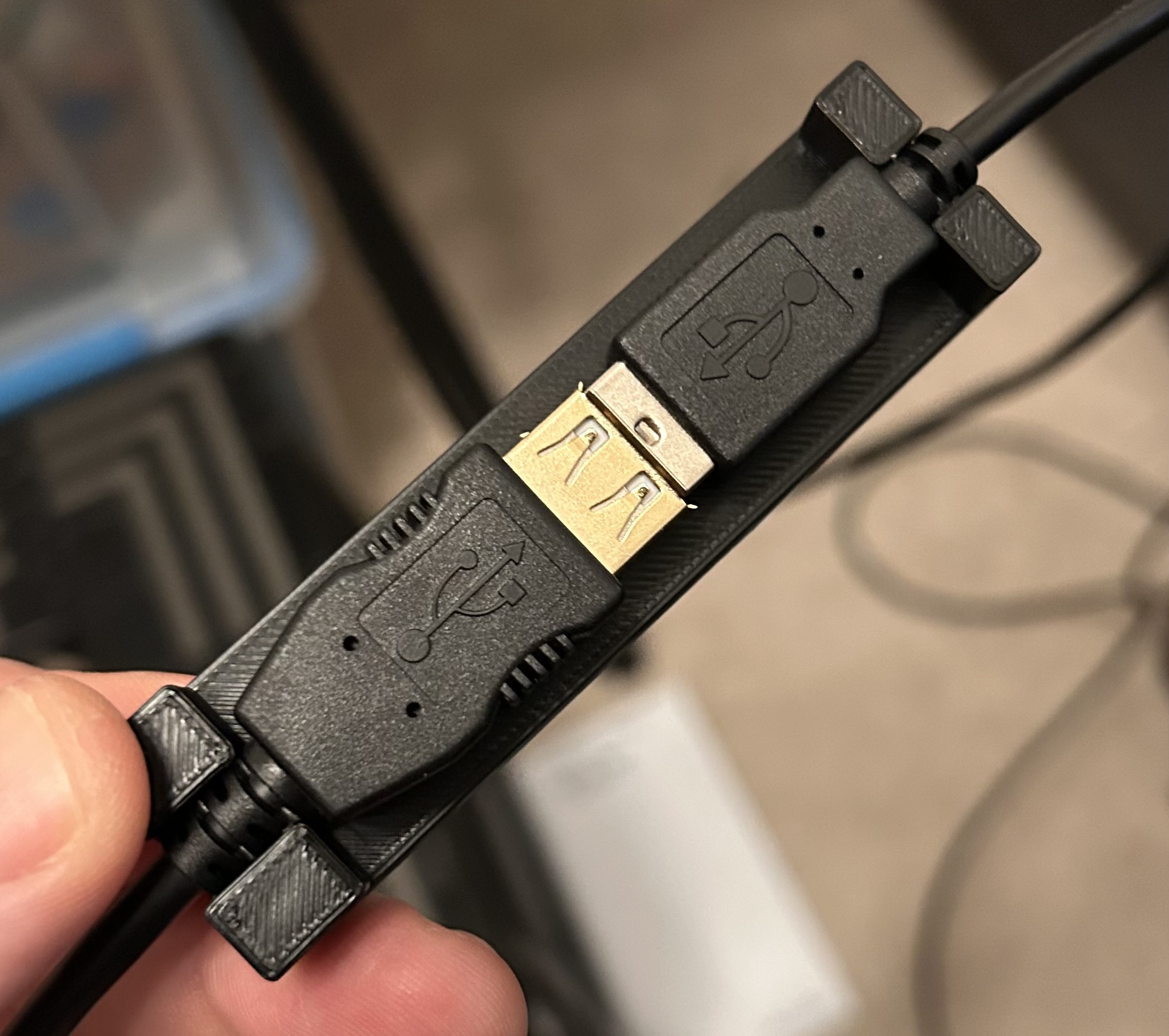 Thiết kế jerkstopper đơn giản cho cáp USBA-Male sang USBA-Female, in low resolution vẫn hoạt động tốt nên chưa tối ưu thêm. Dễ mod để giảm vật liệu hoặc thêm cơ chế khóa; dùng extender U024-010 Eaton Tripp Lite.