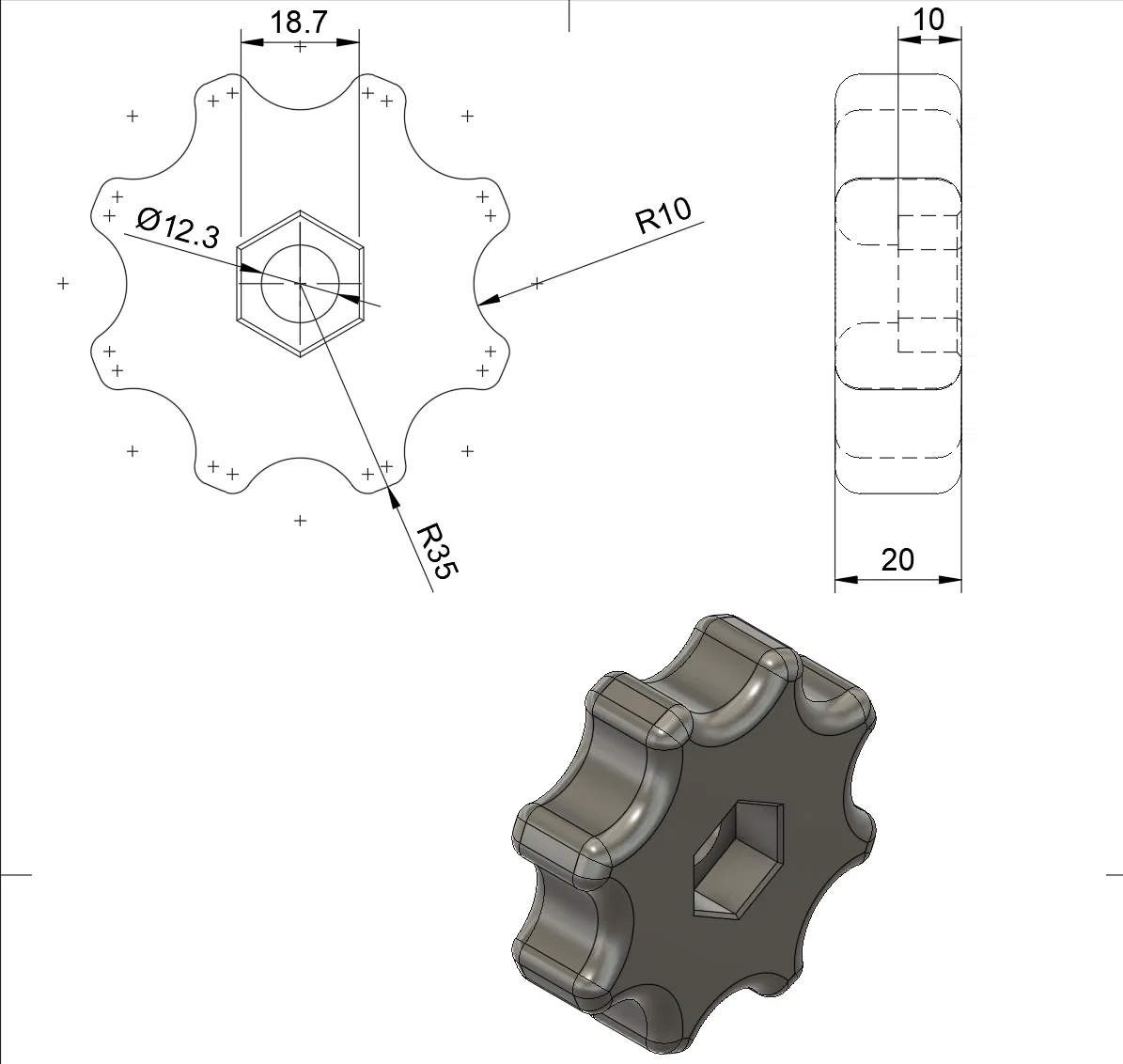 Mẫu M12 Hand Knob giúp siết/nới bu lông M12 khi dùng ê-cu tự hãm. Thiết kế theo kiểu press-fit để ép vừa ê-cu và bu lông M12, có thể làm nóng nhẹ (máy sấy tóc). In PETG-CF chạy ổn.
