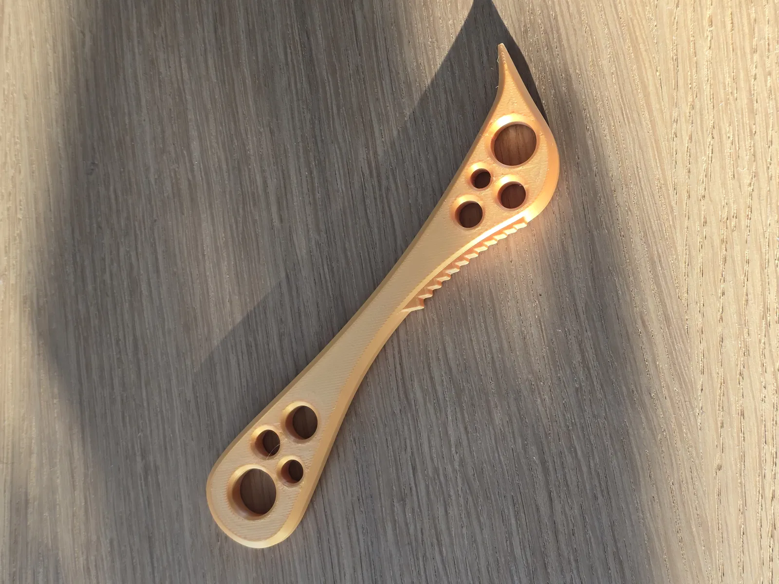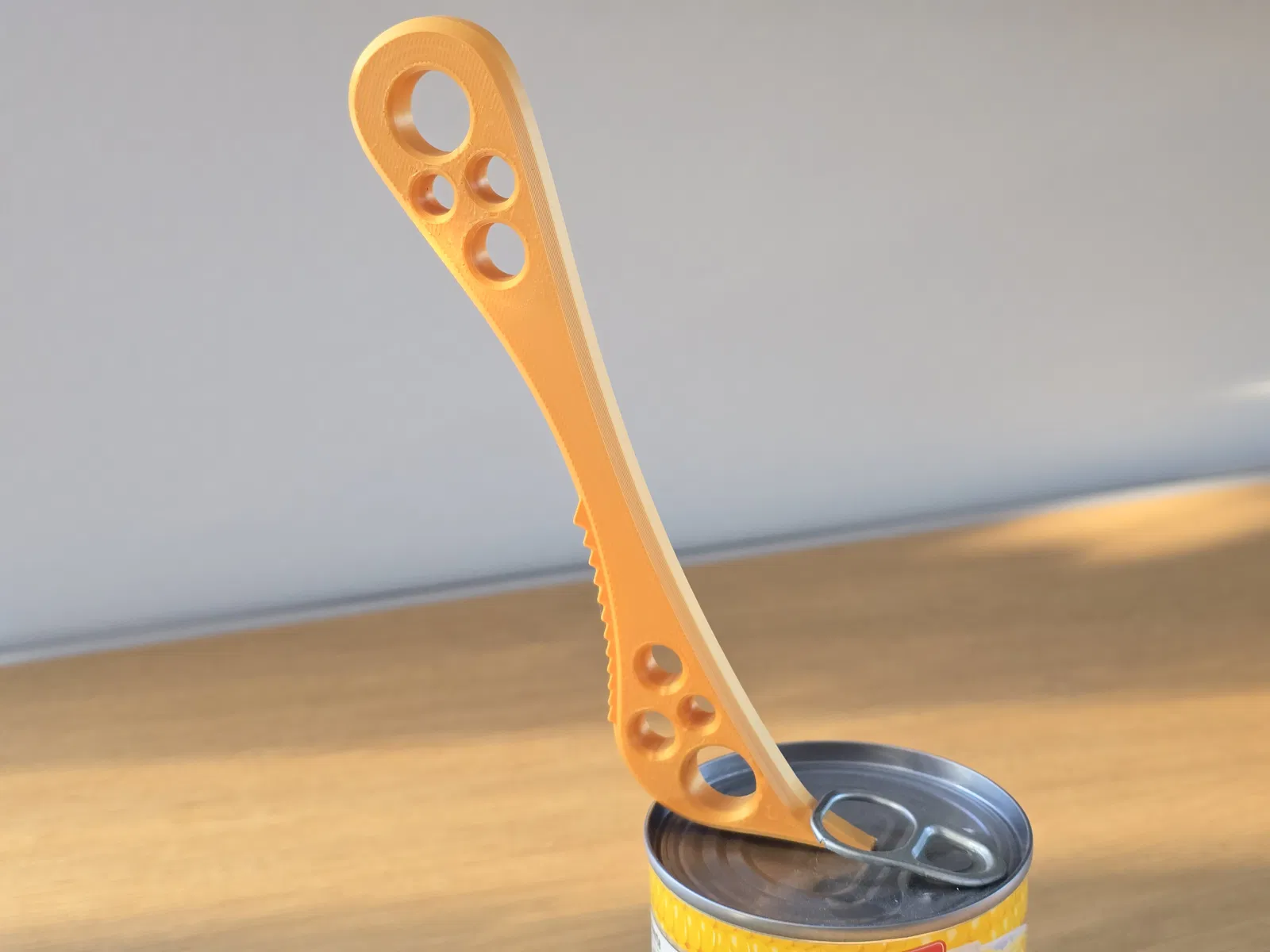 Dụng cụ hỗ trợ mở này cần được luồn xuống dưới cái lẫy (tab), rồi có thể dùng như một đòn bẩy để mở lon. Các răng cưa được thiết kế để bám vào mép lon, giúp dụng cụ không bị trượt.