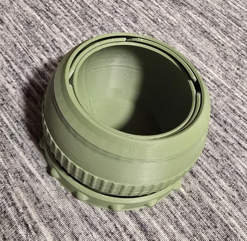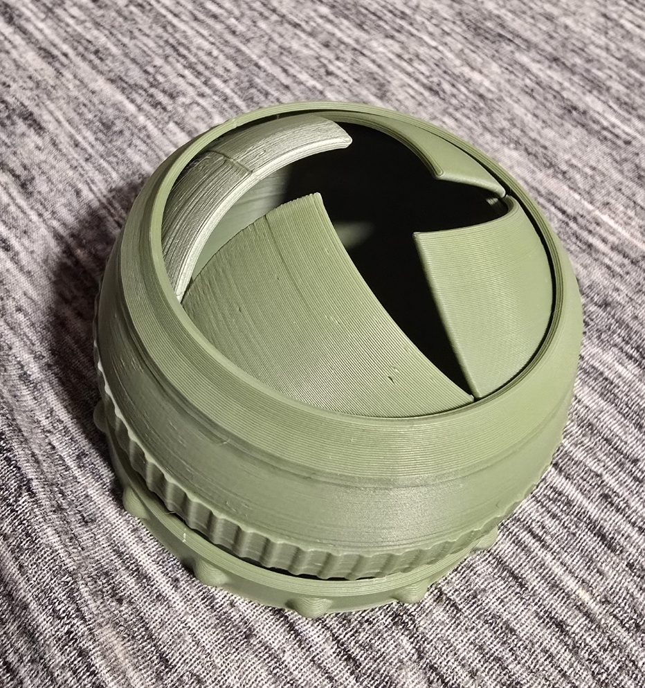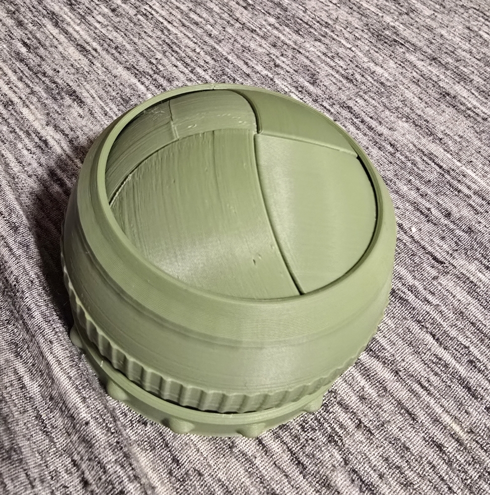 Quả cầu ngoài thật ra là một núm xoay (dial) có thể xoay. Để nới nó ra, chèn một tua vít nhỏ vào khe phía trên vòng đế (base ring) rồi cạy nhẹ cho nó bung, làm dần quanh toàn bộ chu vi. Tùy máy bạn in khe nhỏ tốt cỡ nào, có thể bạn sẽ cần luồn một lưỡi mỏng vào các khe ở phía trên để nới các lá ra.)
